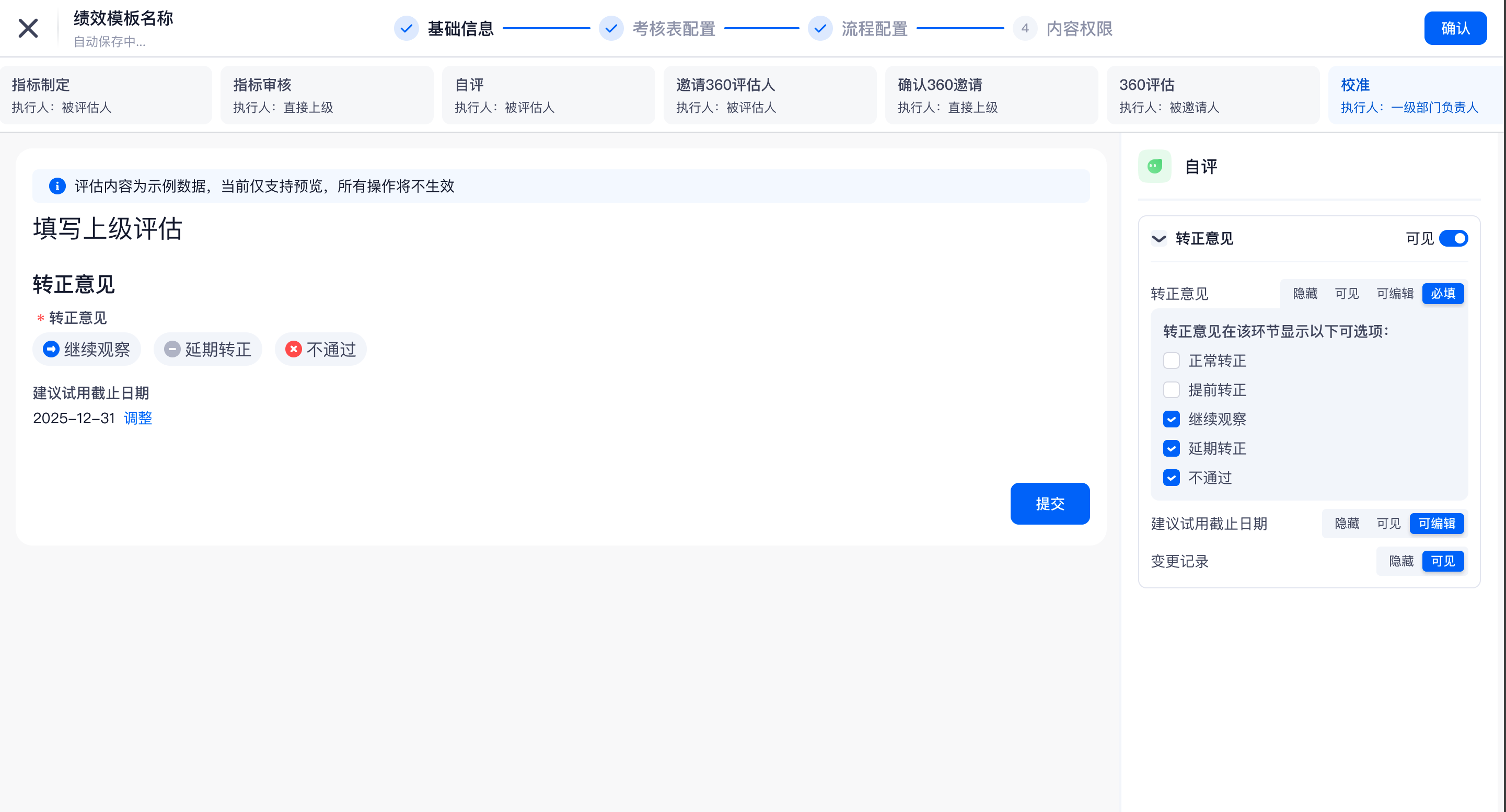 不支持针对试用期不同环节设置转正意见的选项的展示 / 隐藏