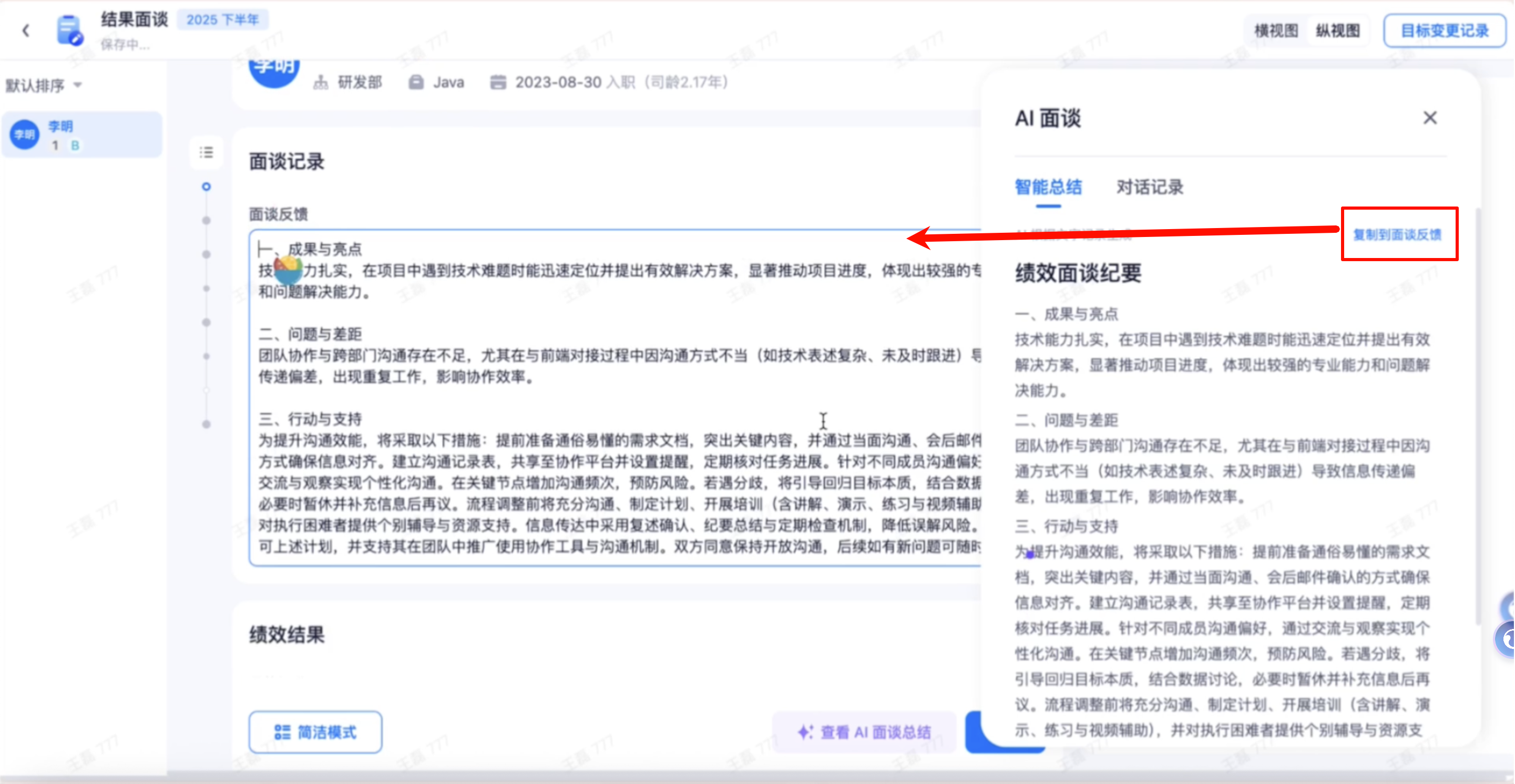 点击「复制到面谈反馈」,可将智能总结的内容一键粘贴到面谈反馈中,在面谈反馈输入框中,仍可自己做修改。