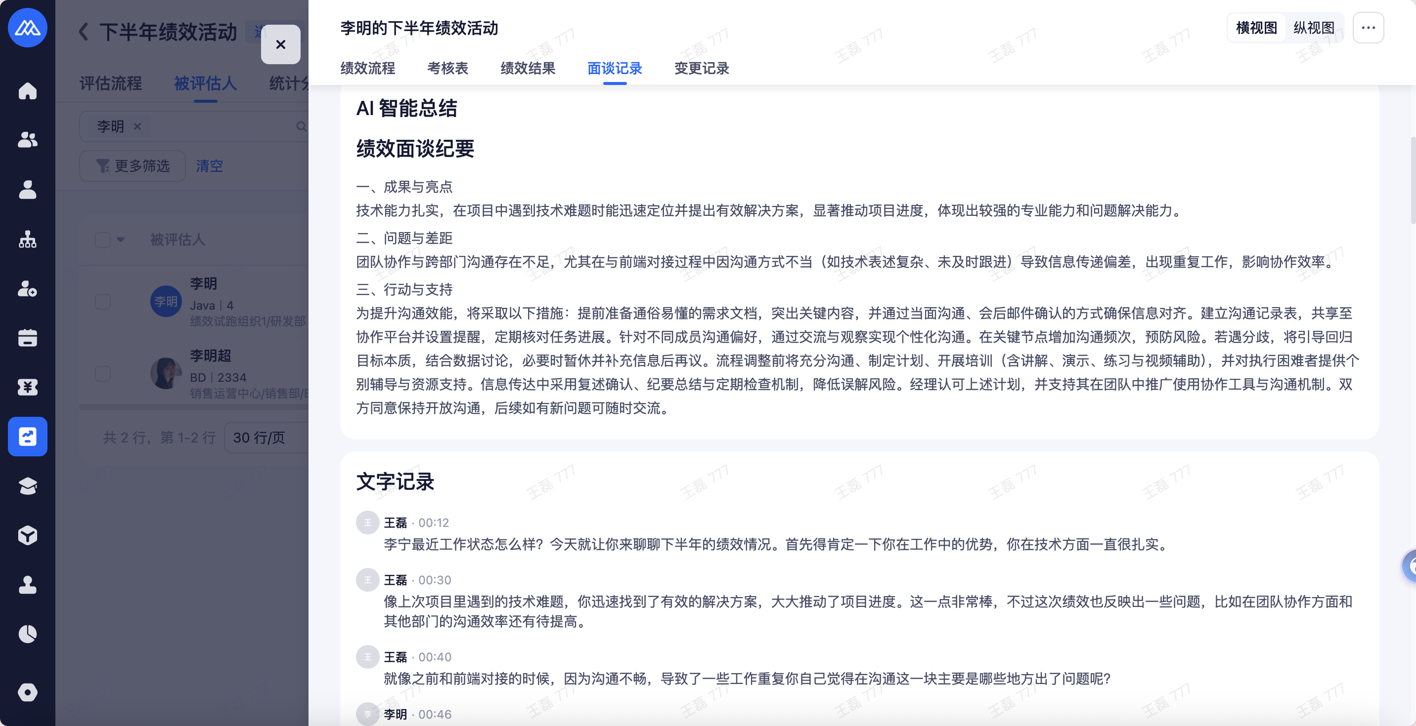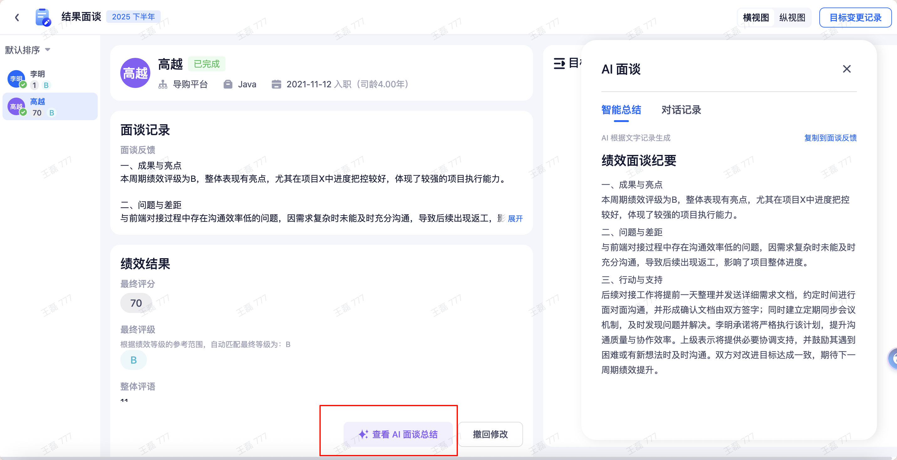 发起AI面谈的人,可在结果面谈页面点击「查看AI面谈总结」查看智能总结与对话记录