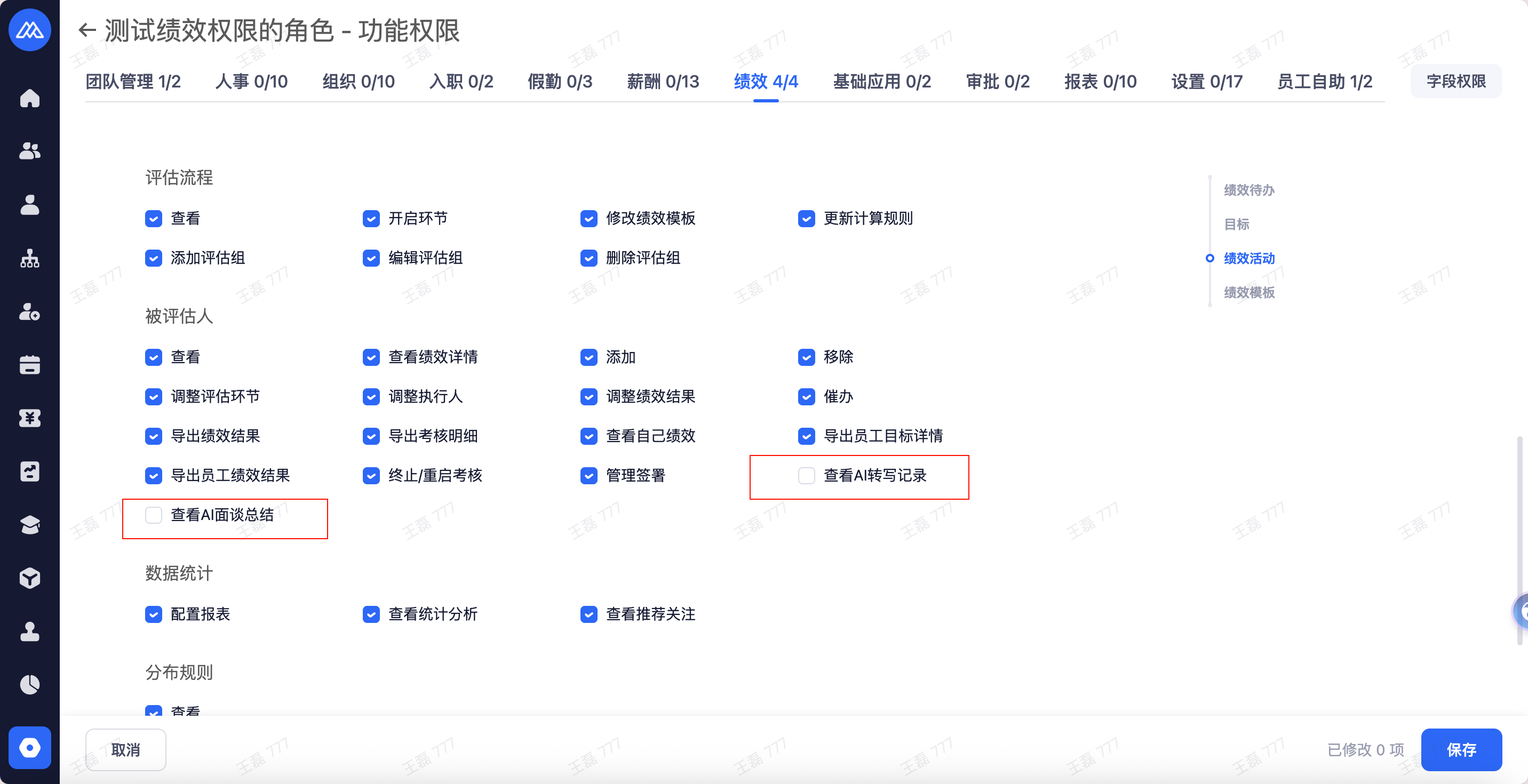 设置-功能权限-绩效-被评估人:该路径下新增权限点「查看AI面谈总结」、「查看AI转写记录」