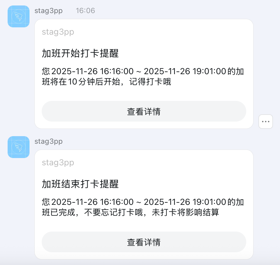 加班结束提醒:加班申请的结束时间后N分钟提醒