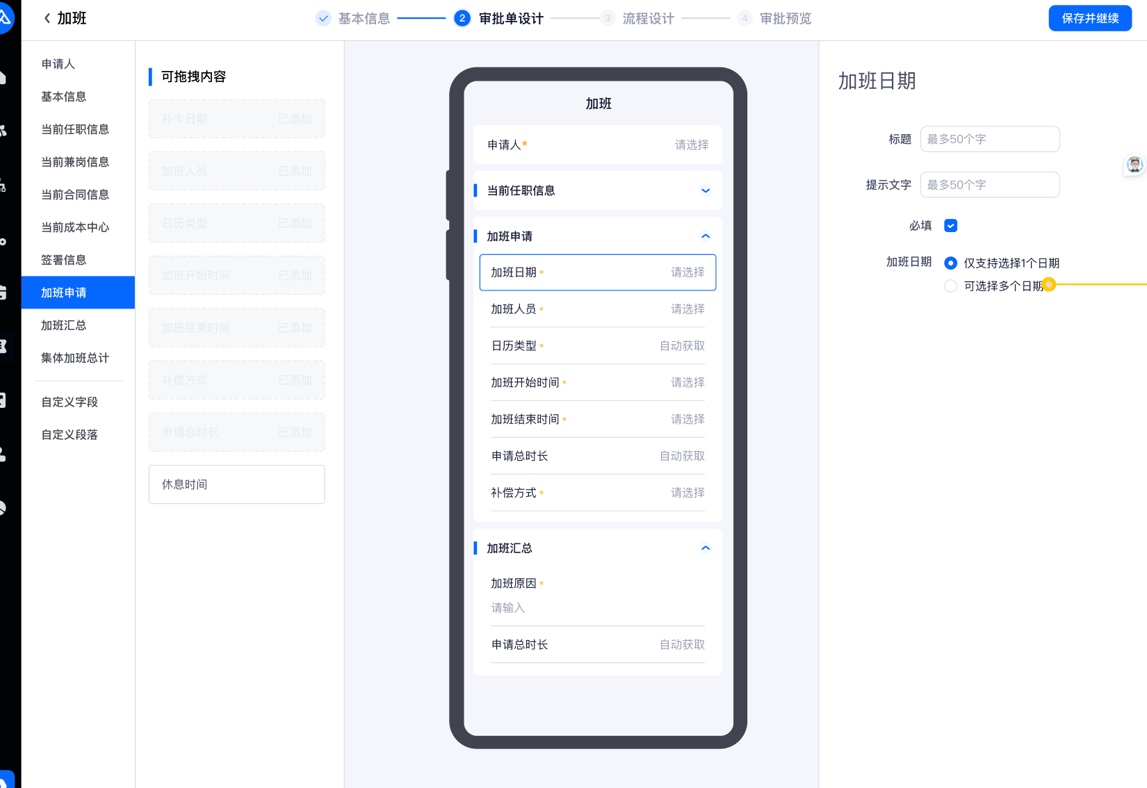 审批单设计中,加班日期字段可配置是否允许选择多个日期