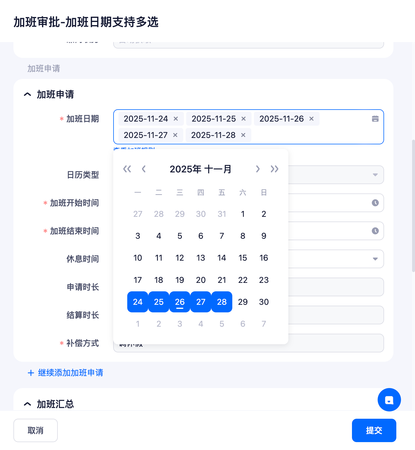 允许添加多个日期后,在申请加班时,可一次性选择多个日期