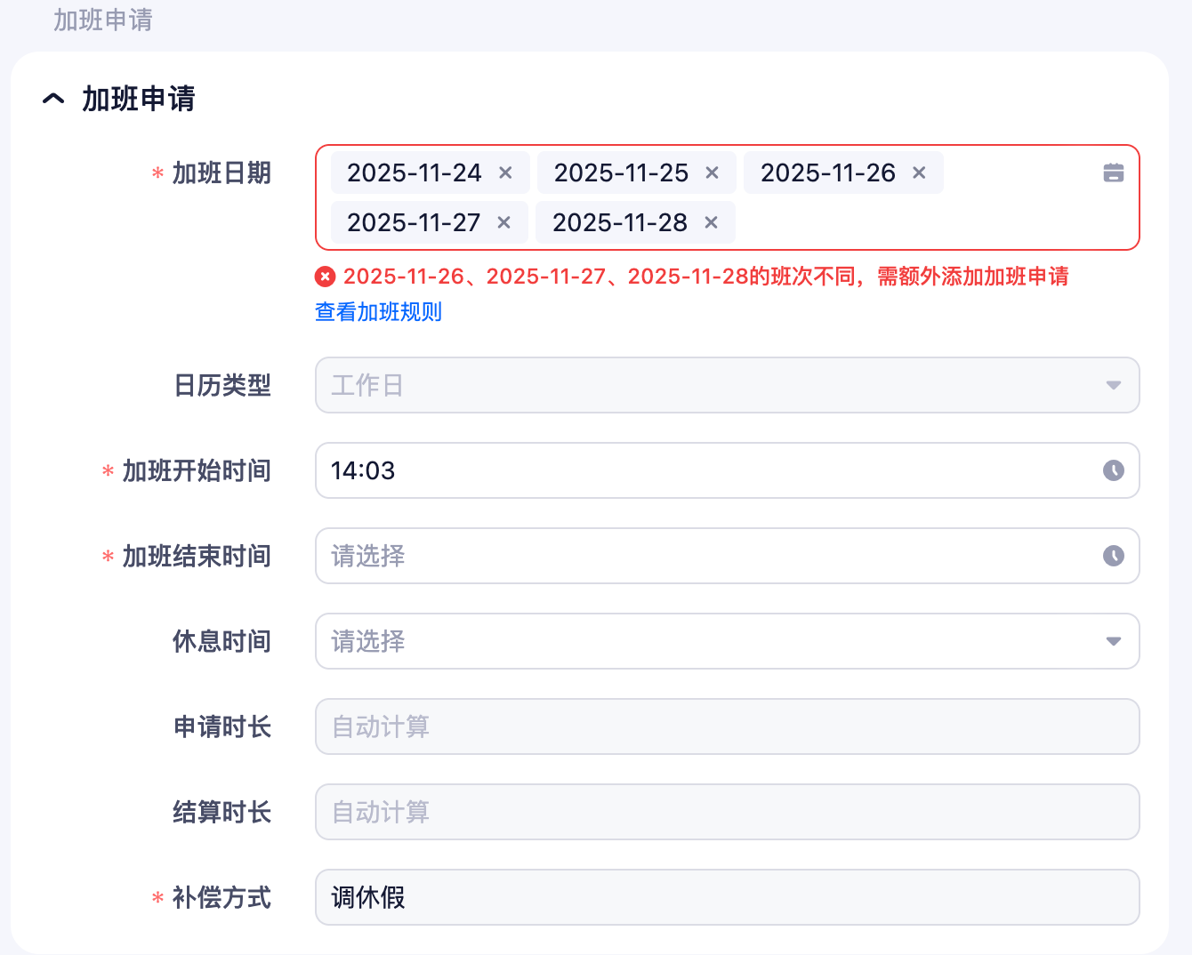 日期选择将校验加班日期的加班规则、日历类型、班次设置是否一致,不一致时将阻断:YYYY-MM-DD、YYYY-MM-DD的加班规则/班次不同,需额外添加加班申请