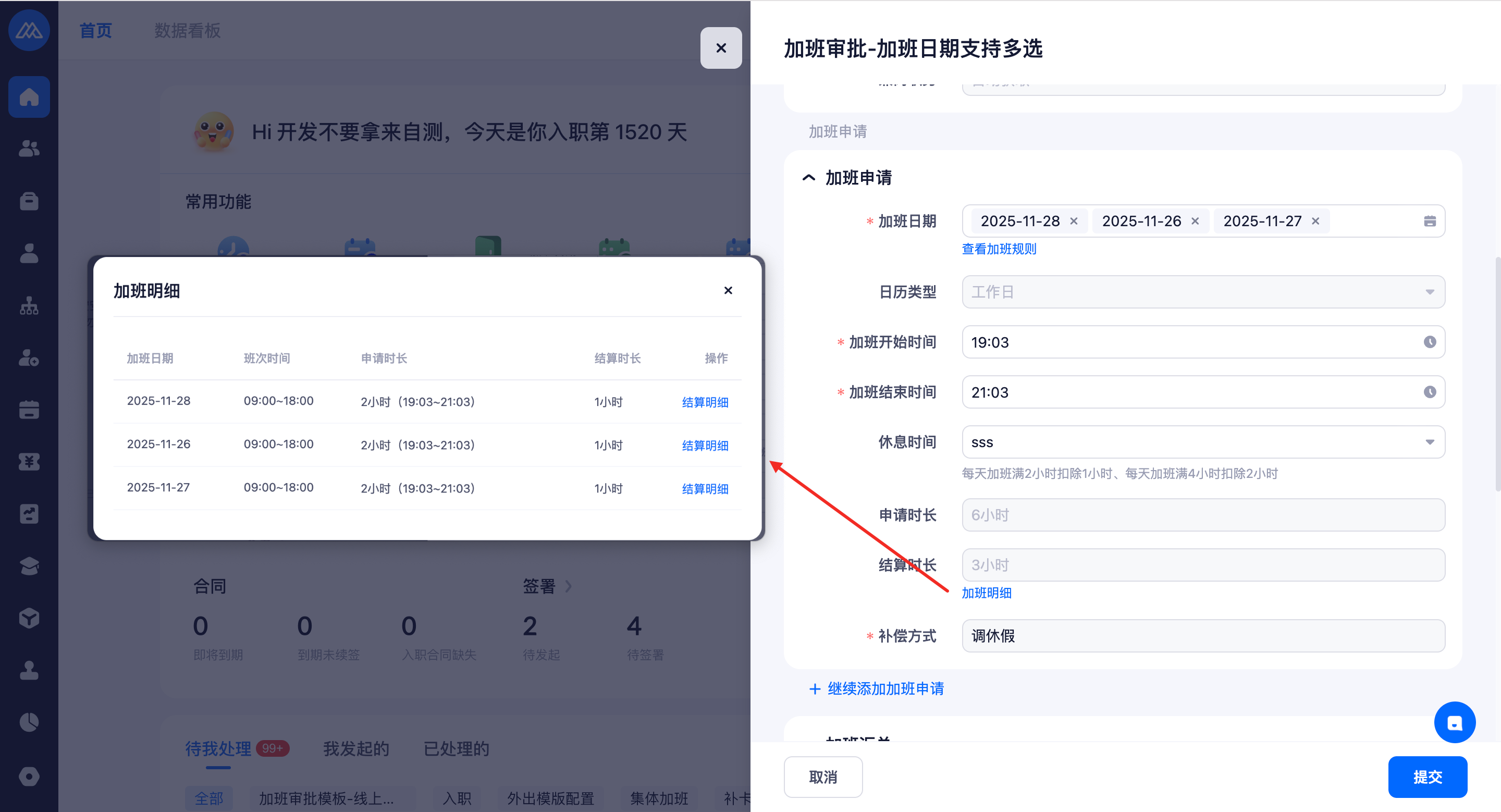 提交后,将按明细表中的加班日期对应生成多条加班记录,即一个明细组对应多条加班记录。