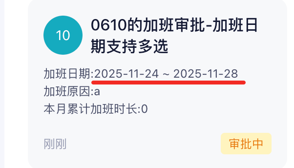 审批默认摘要中的加班日期,将取表单内最早~最晚的日期进行展示