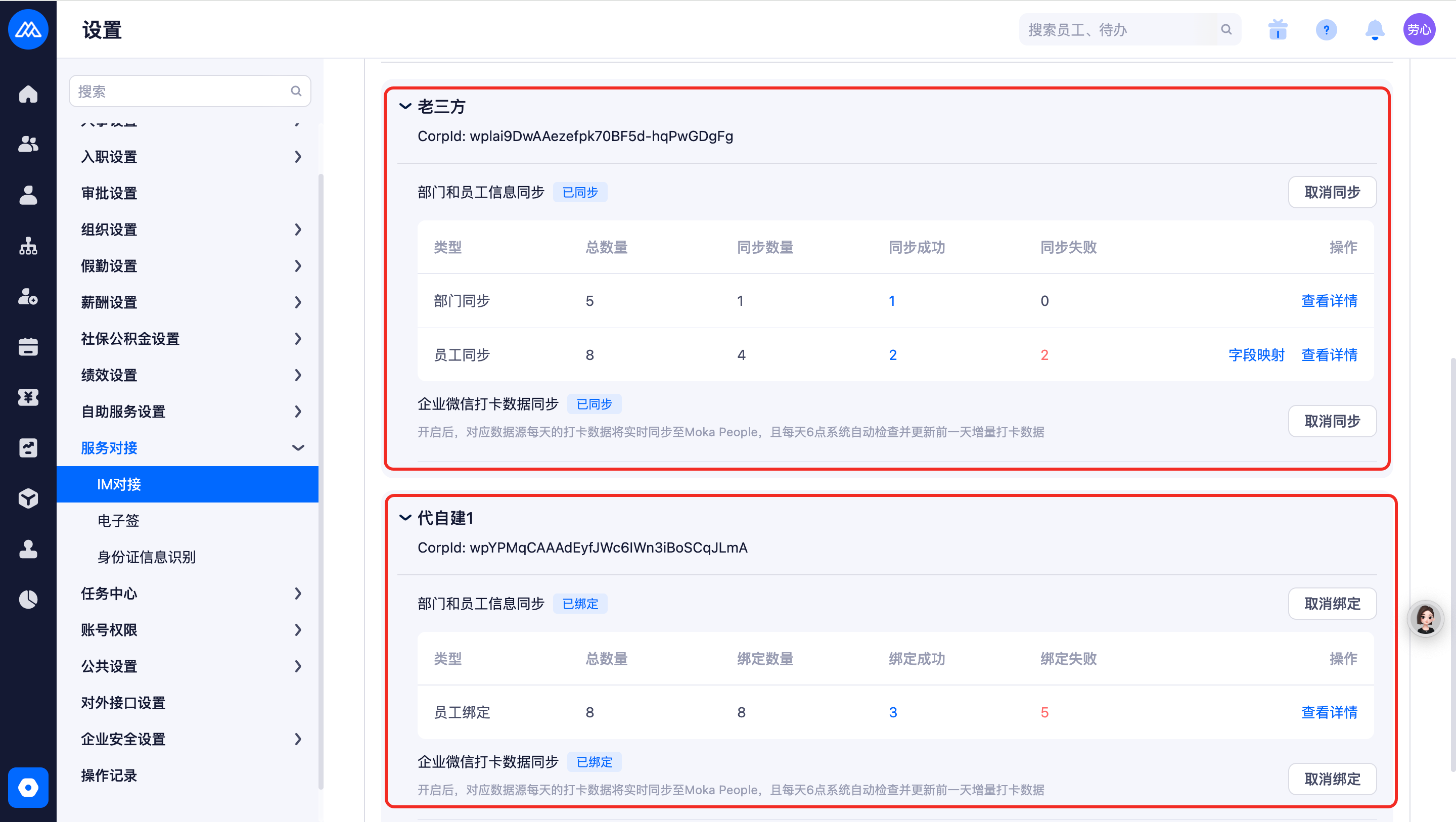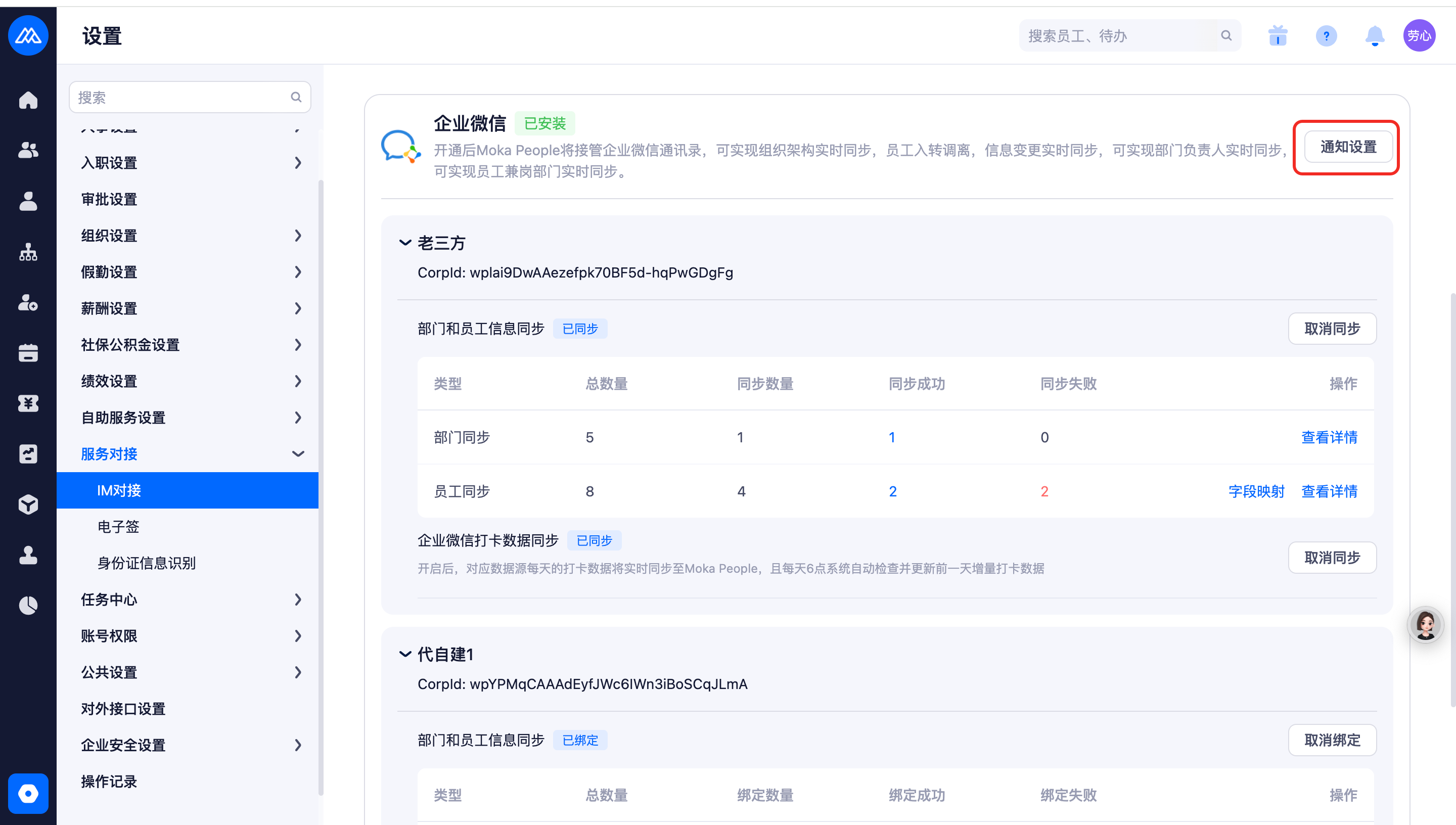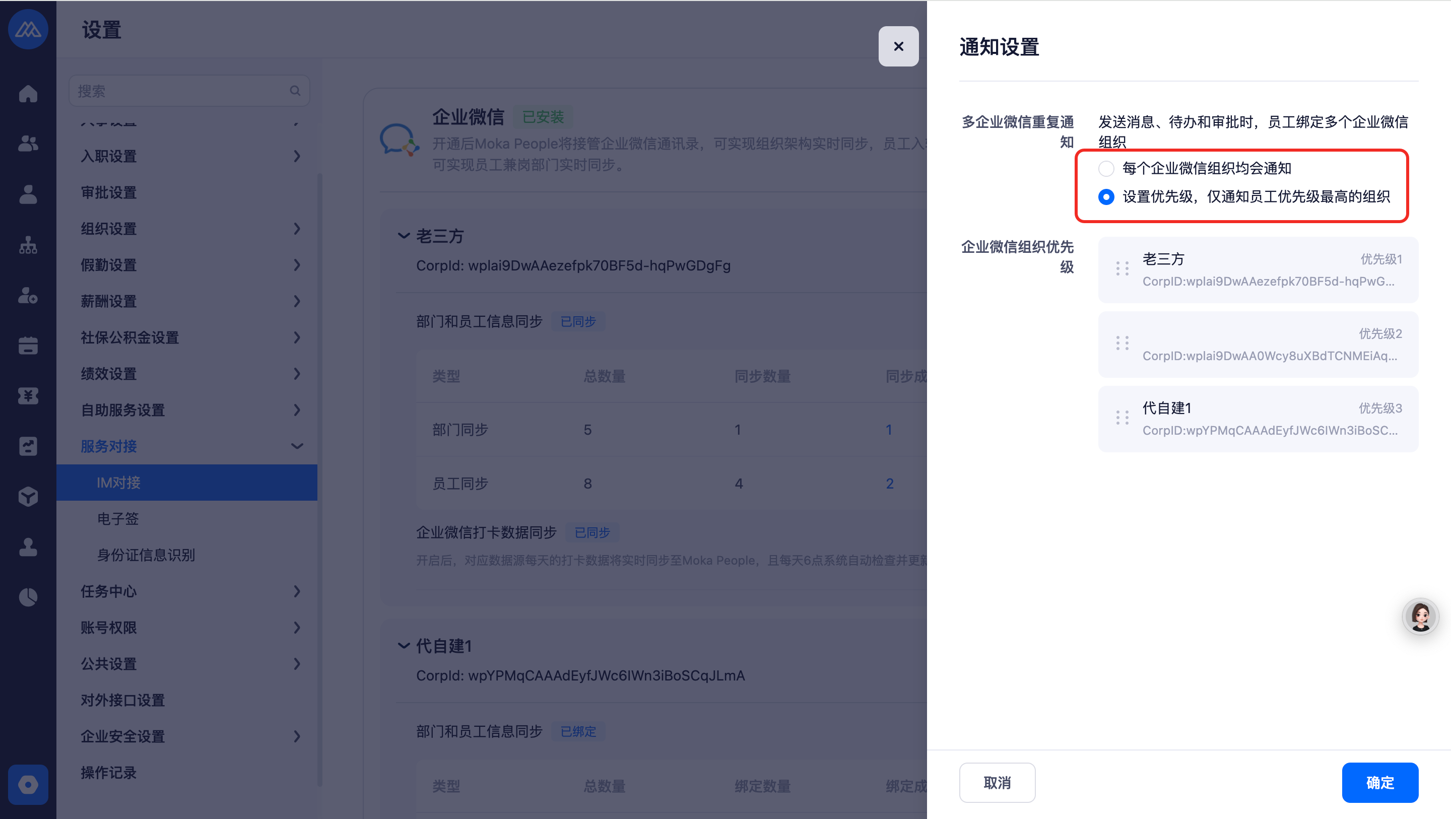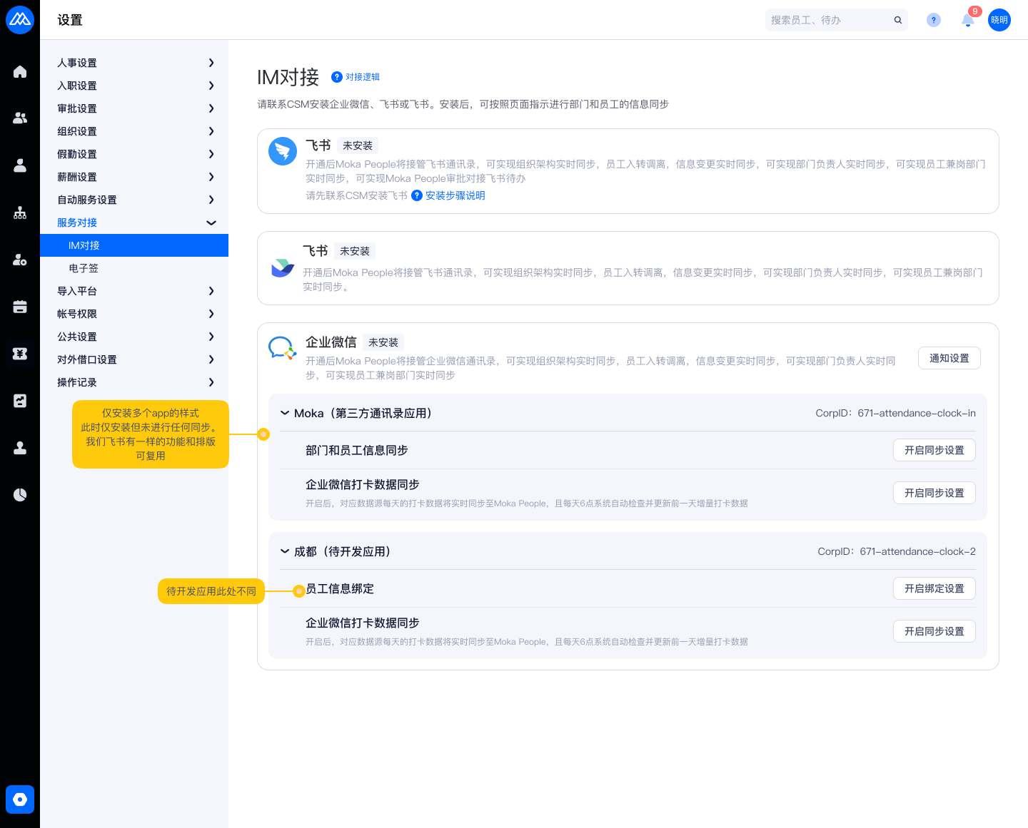 同一个客户同时在使用多套企业微信,但需要用一个 Moka People 租户进行人力资源管理,故需要一个 Moka People 集成多个企业微信租户。