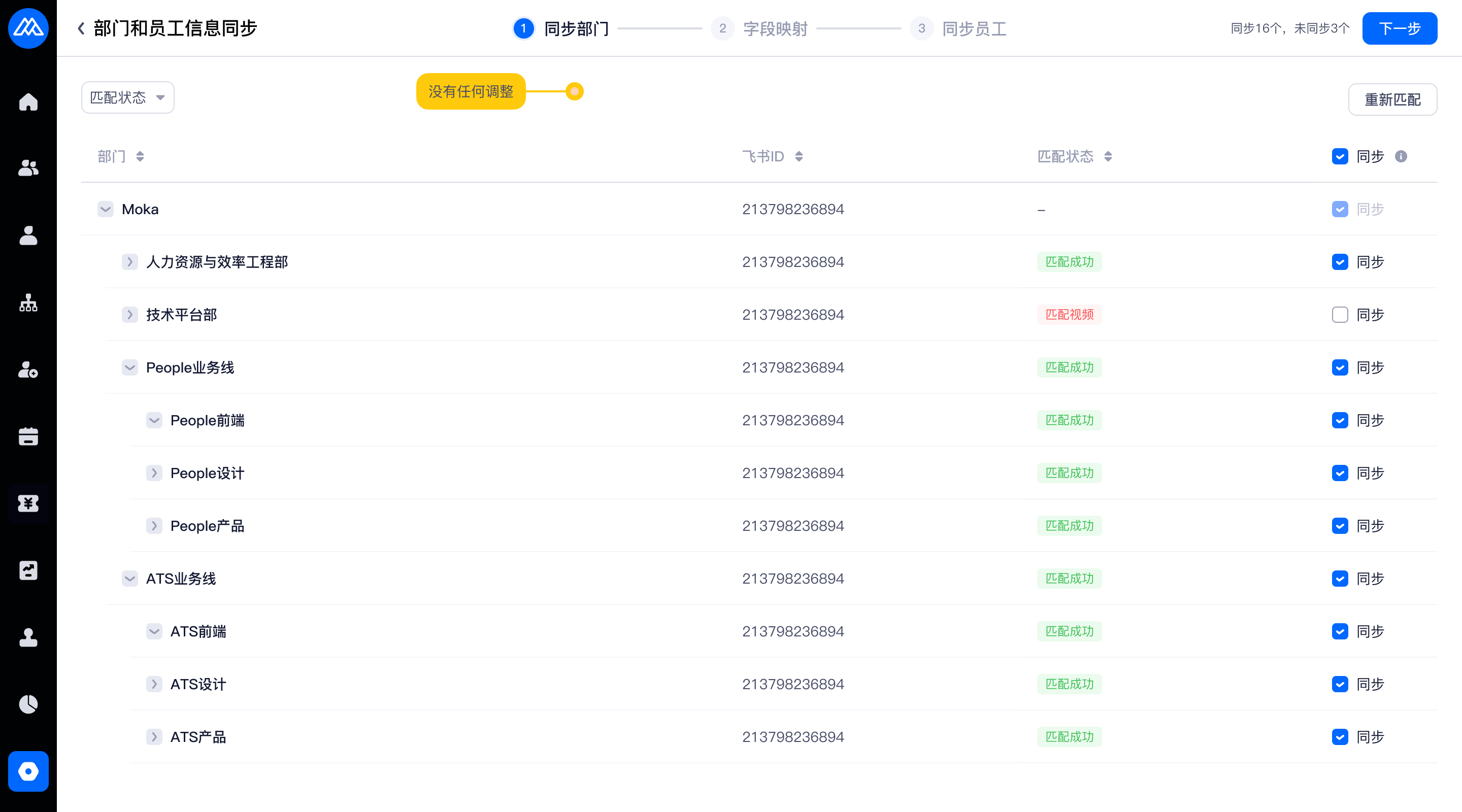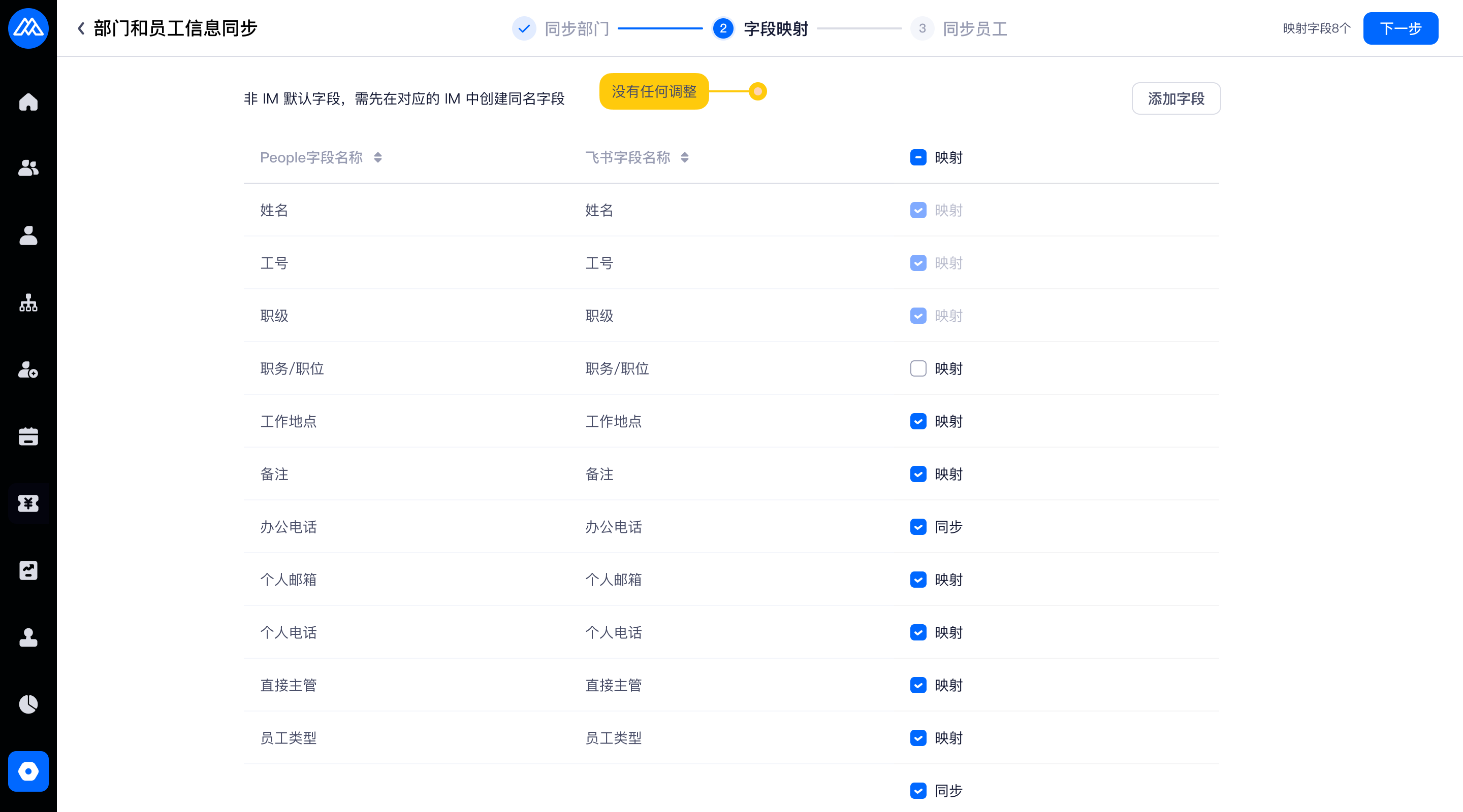 初始化设置与当前相同,设置哪些部门、员工(含字段映射)需同步至该 IM,需要注意: