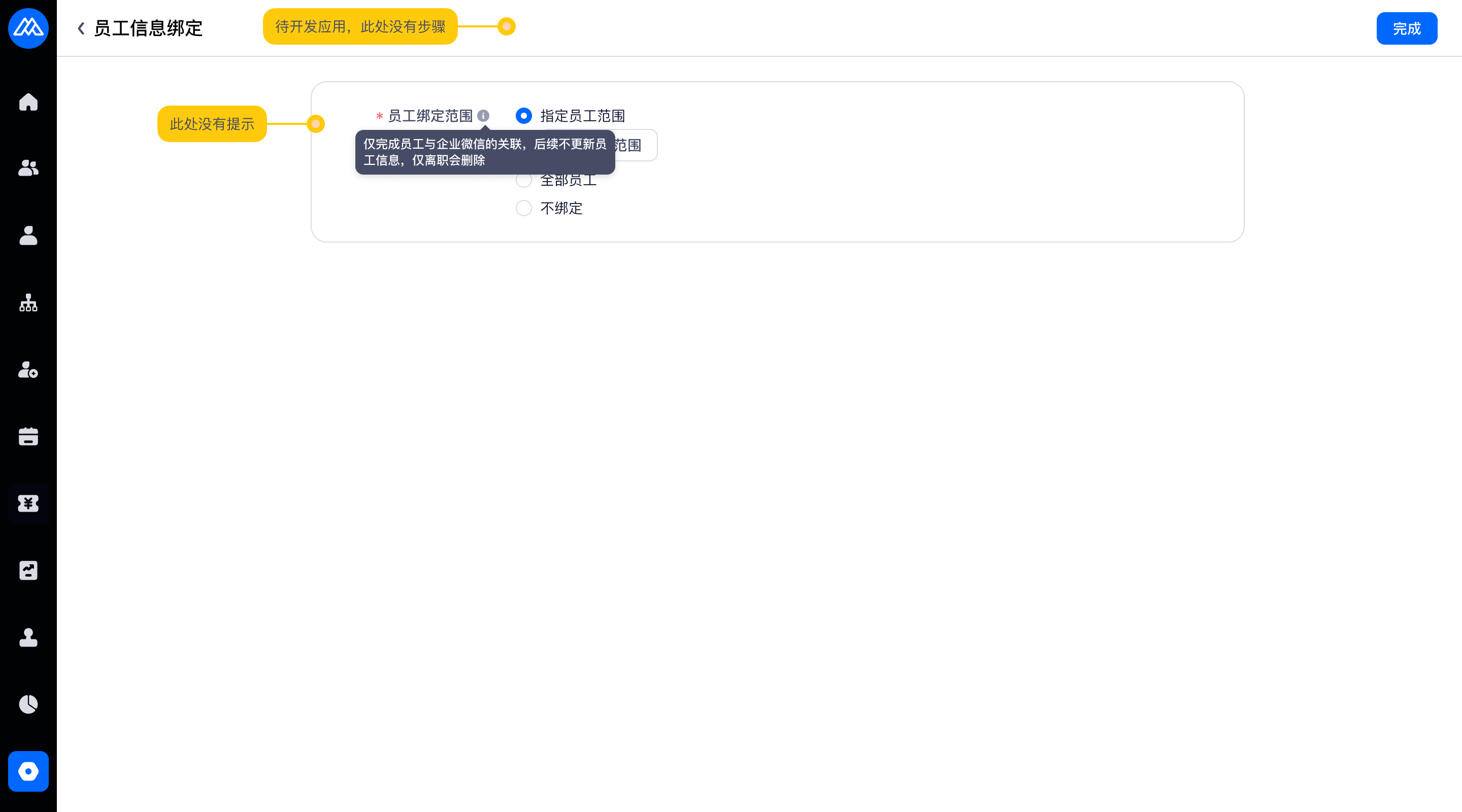 关于绑定范围的全局逻辑说明:范围设定的哪些员工需要绑定,不是是否绑定;无论选择什么范围,规则仅影响初始化首次圈选员工、新入职的员工,不影响完成初始化后已有员工的绑定状态