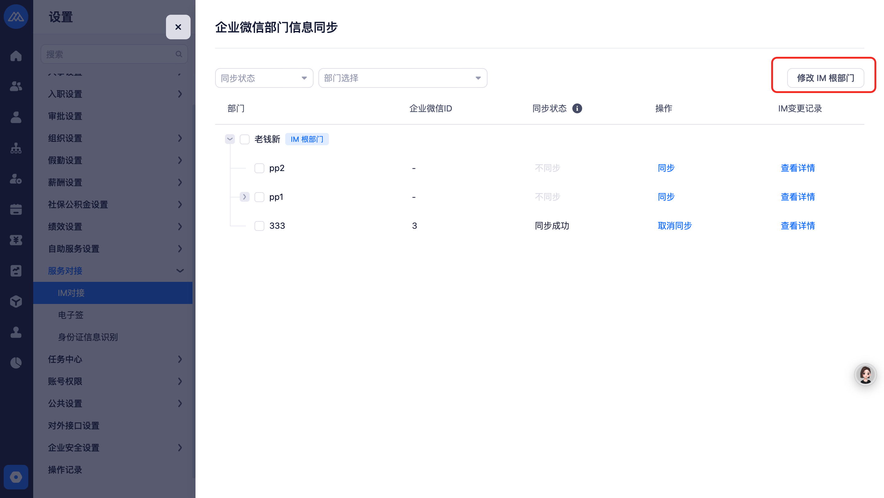 支持查看部门的同步信息,支持修改部门的同步,支持修改IM的根部门