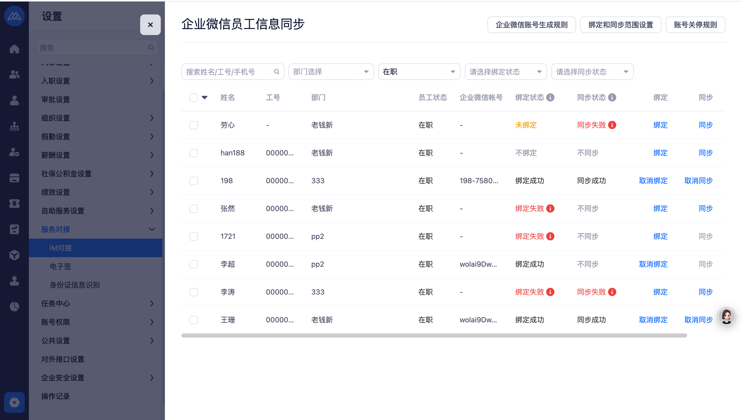若初始化后由于员工异动、或组织架构调整、或者调整了绑定范围,导致:已绑定的员工不再满足适用范围、或者未绑定的员工重新满足适用范围,均不会自动触发取消绑定 / 新增绑定