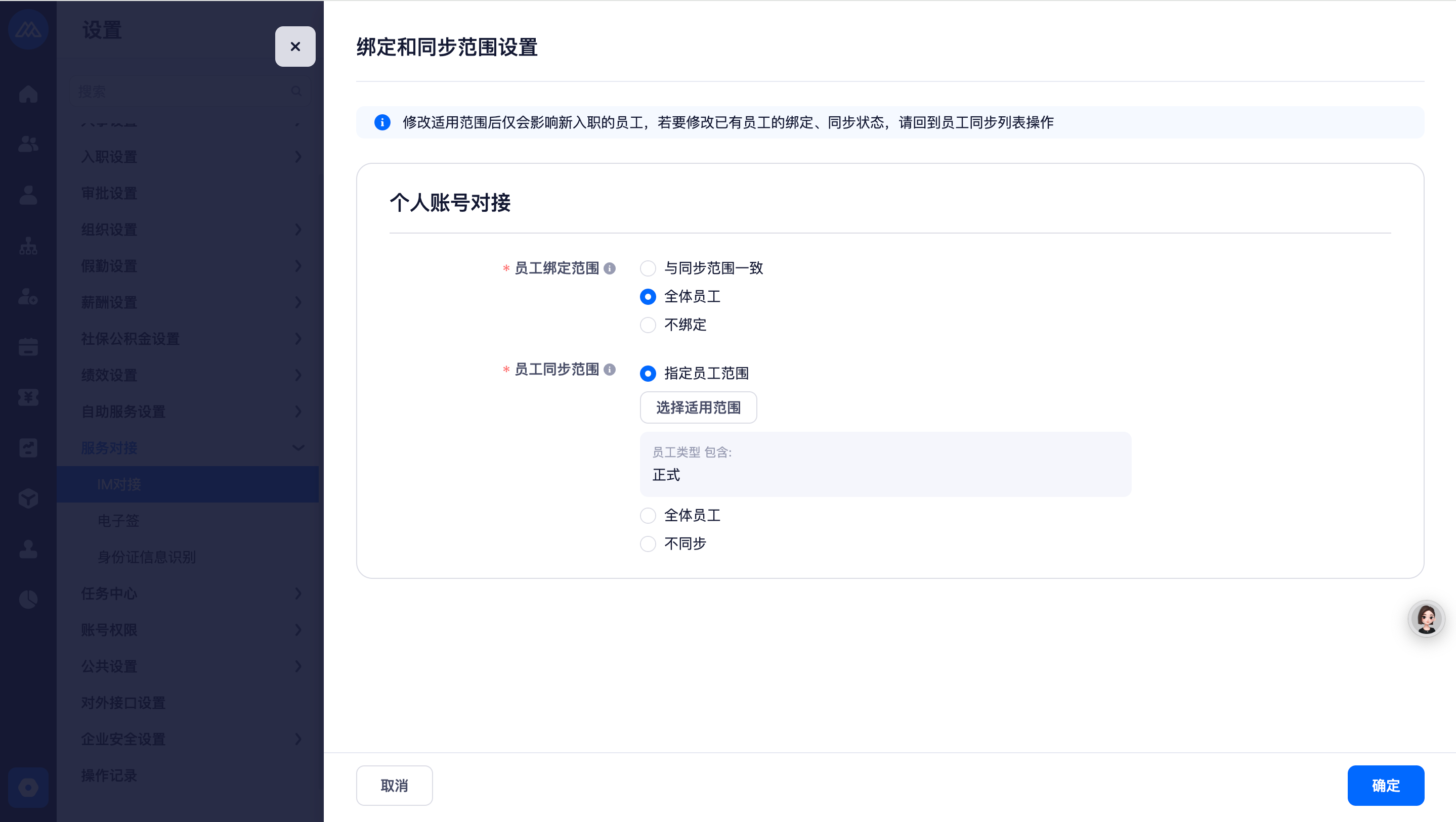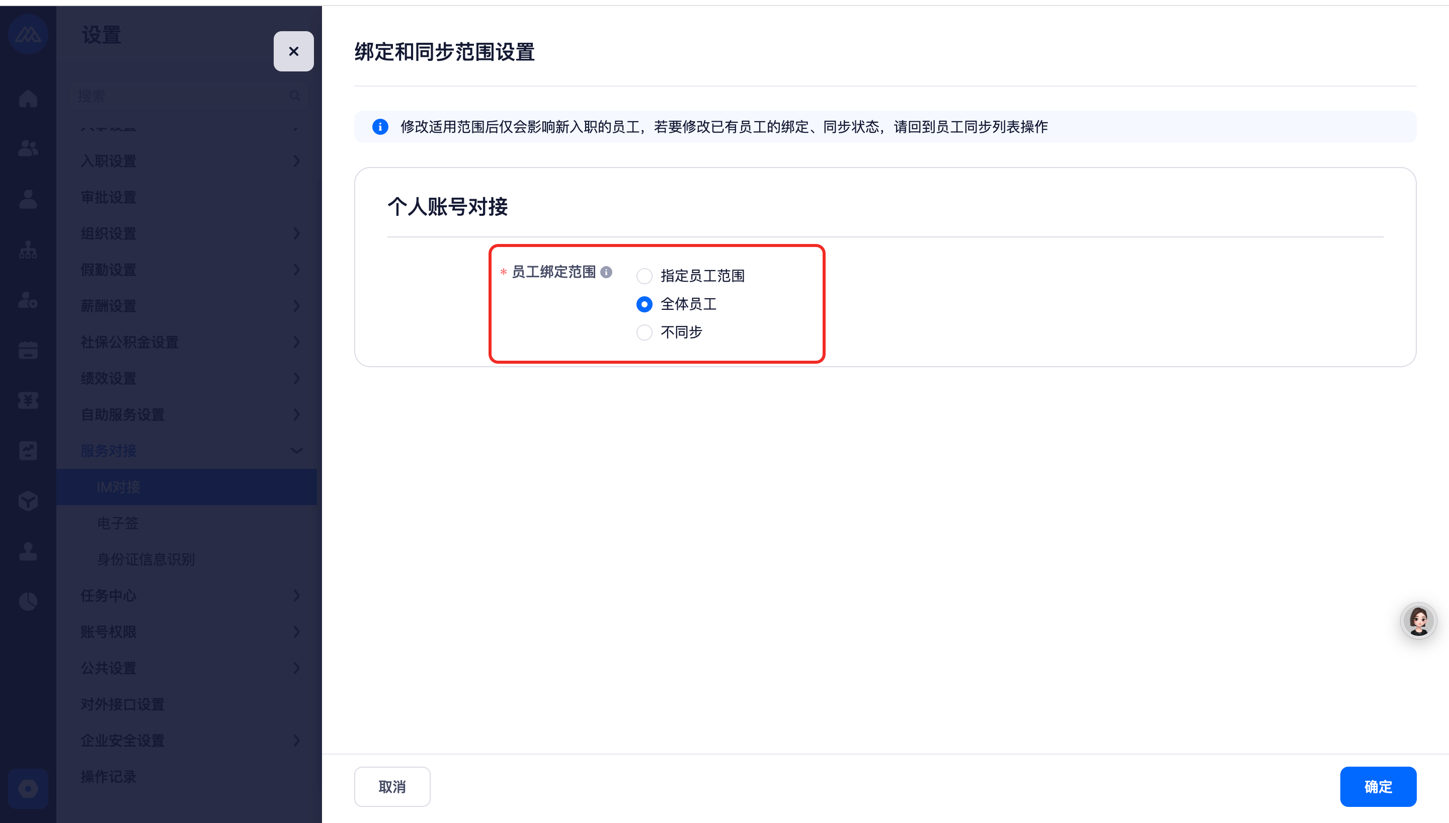 与初始化相同,需要选择「员工同步范围」和「员工绑定范围」,该两个范围仅会决定新入职的员工是否同步、绑定,修改后不影响已有员工的绑定或同步状态