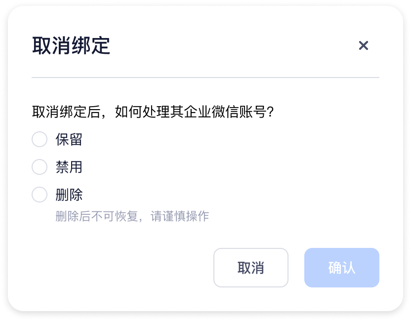 手动操作取消绑定时,新增支持可选企业微信账号是否保留 / 禁用 / 删除