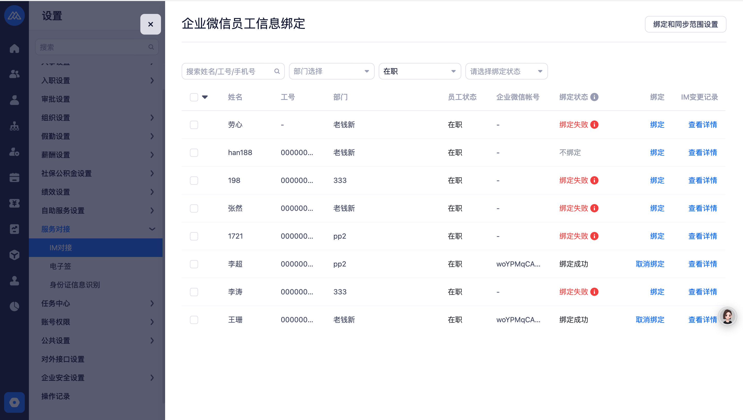 仅支持查看和管理员工绑定情况,可以修改员工的绑定范围