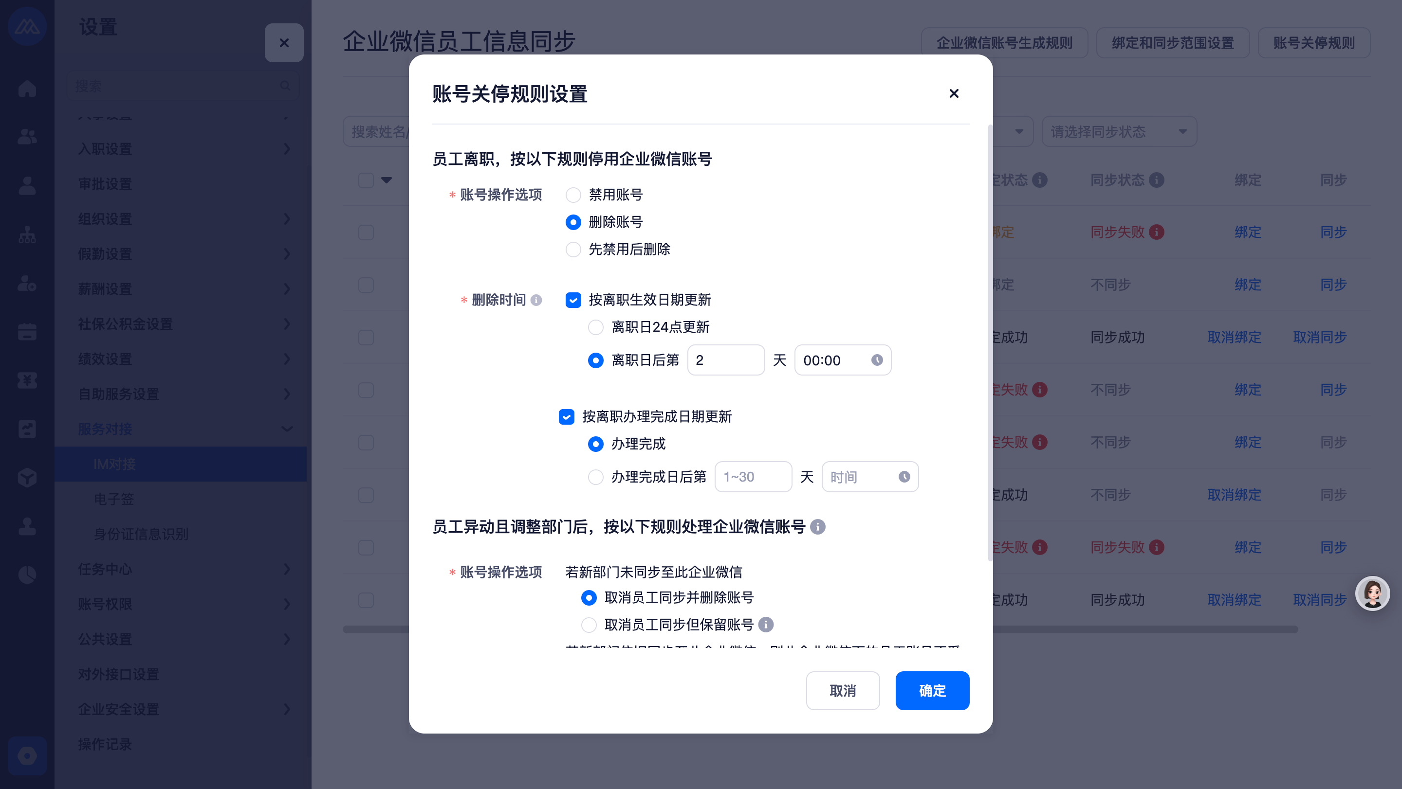 若不同步,则员工账号会取消同步,但是否删除/禁用/保留账号可配置