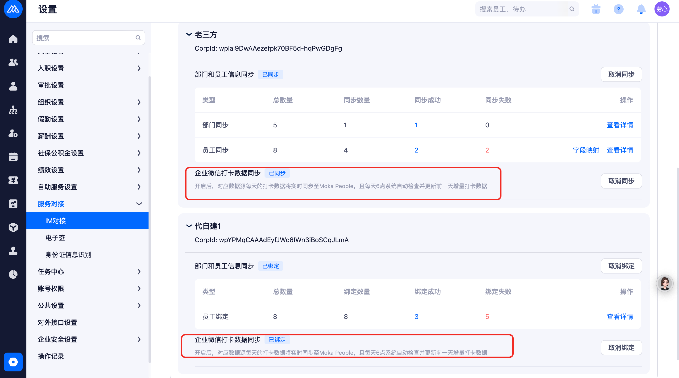 打卡记录支持 by 每个 IM 进行设置是否需同步,若多个 IM 均开启了同步,且同一个员工同时在多个 IM 中,所有 IM 的打卡记录均会同步至people