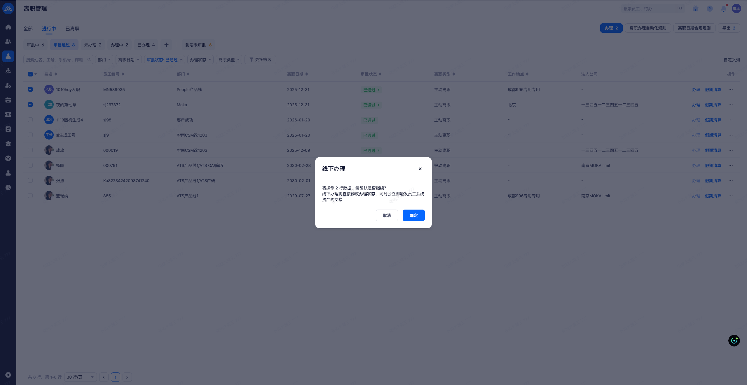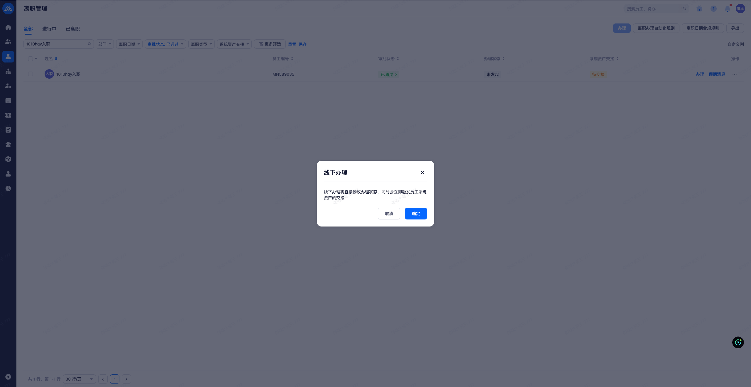 提示文案优化为:线下办理将直接修改办理状态,同时会立即触发员工系统资产的交接