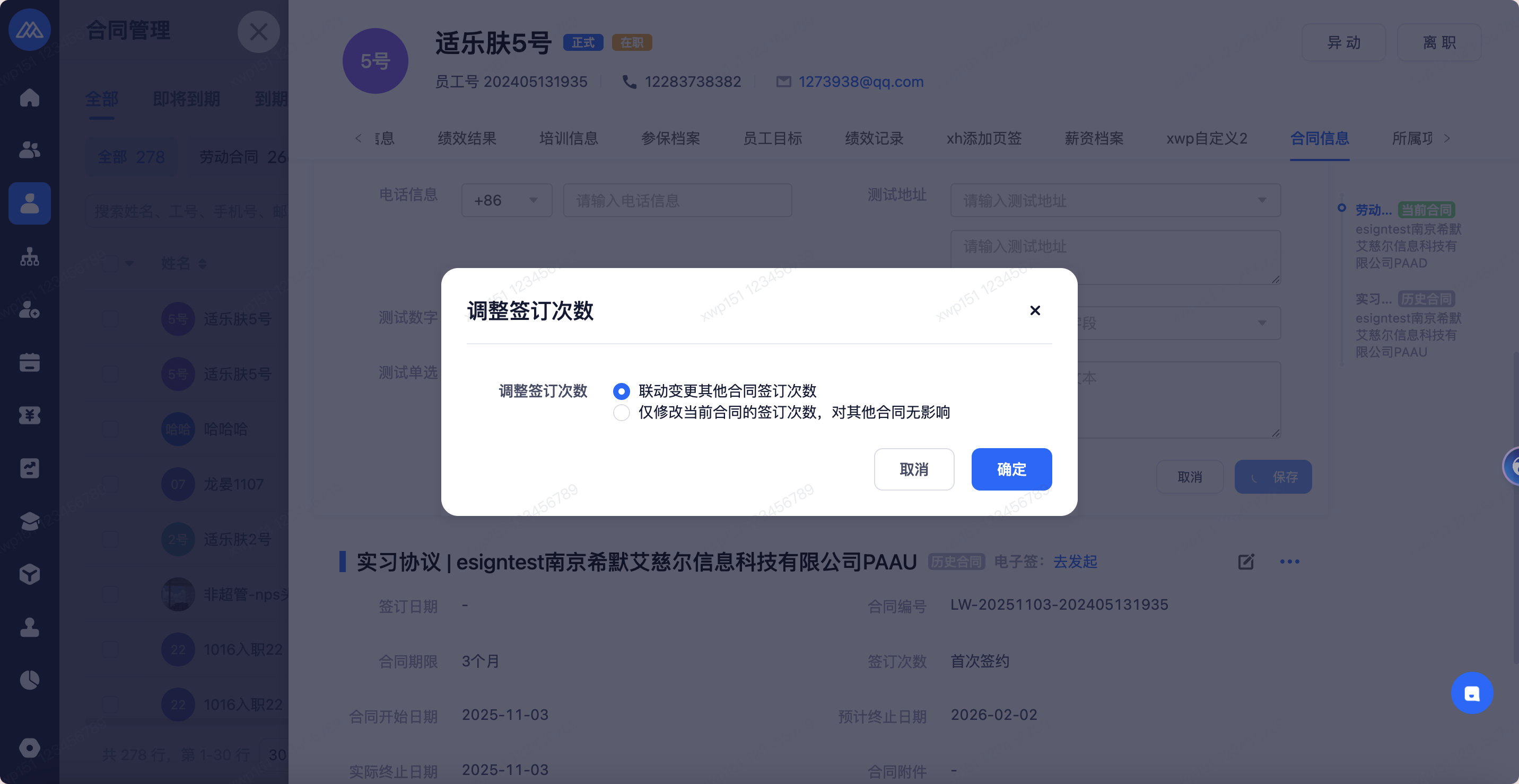 员工详情页修改合同的签订次数,会默认联动变更相关合同的签订次数