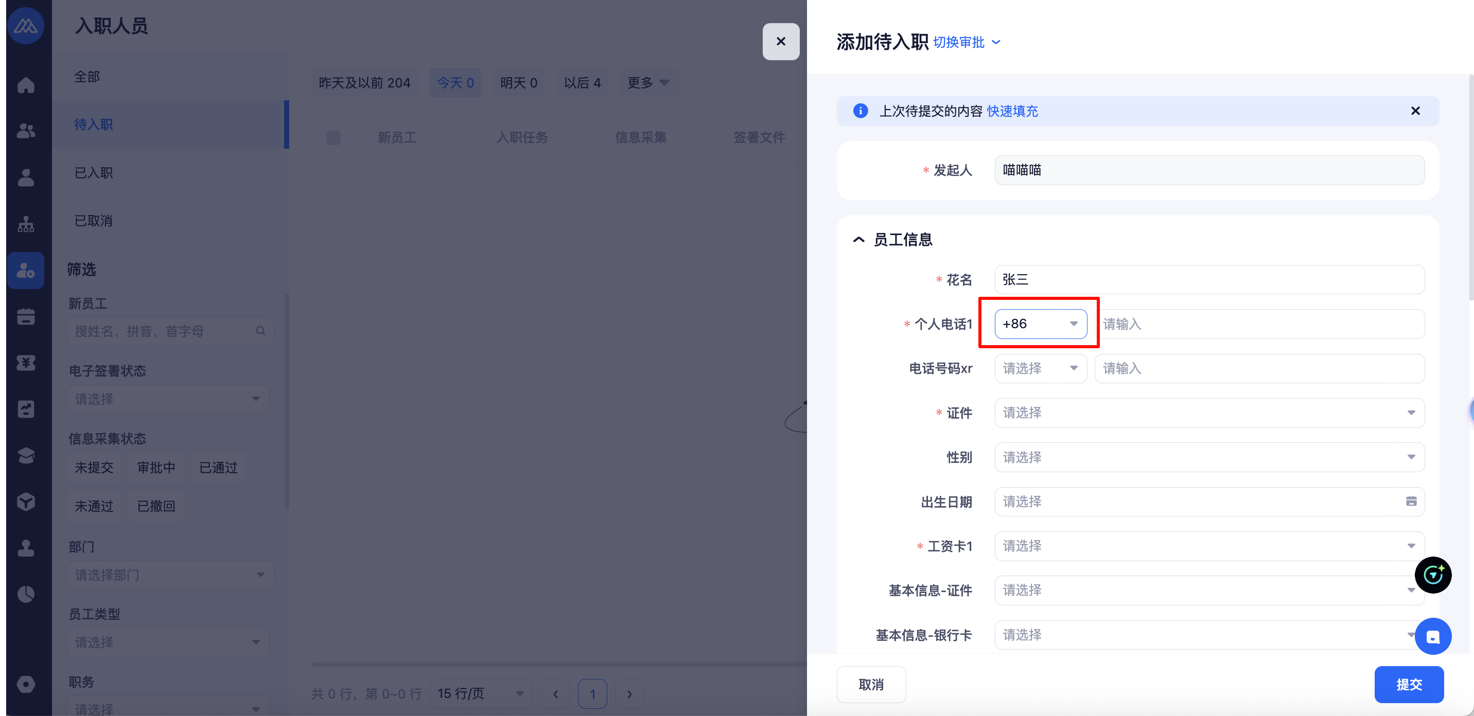 在审批表单中,所有电话号码字段的区号都会默认填充为+86