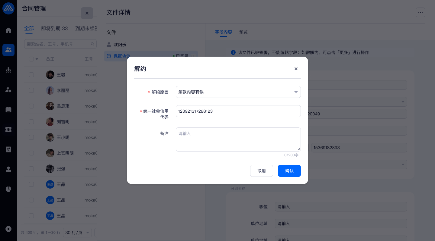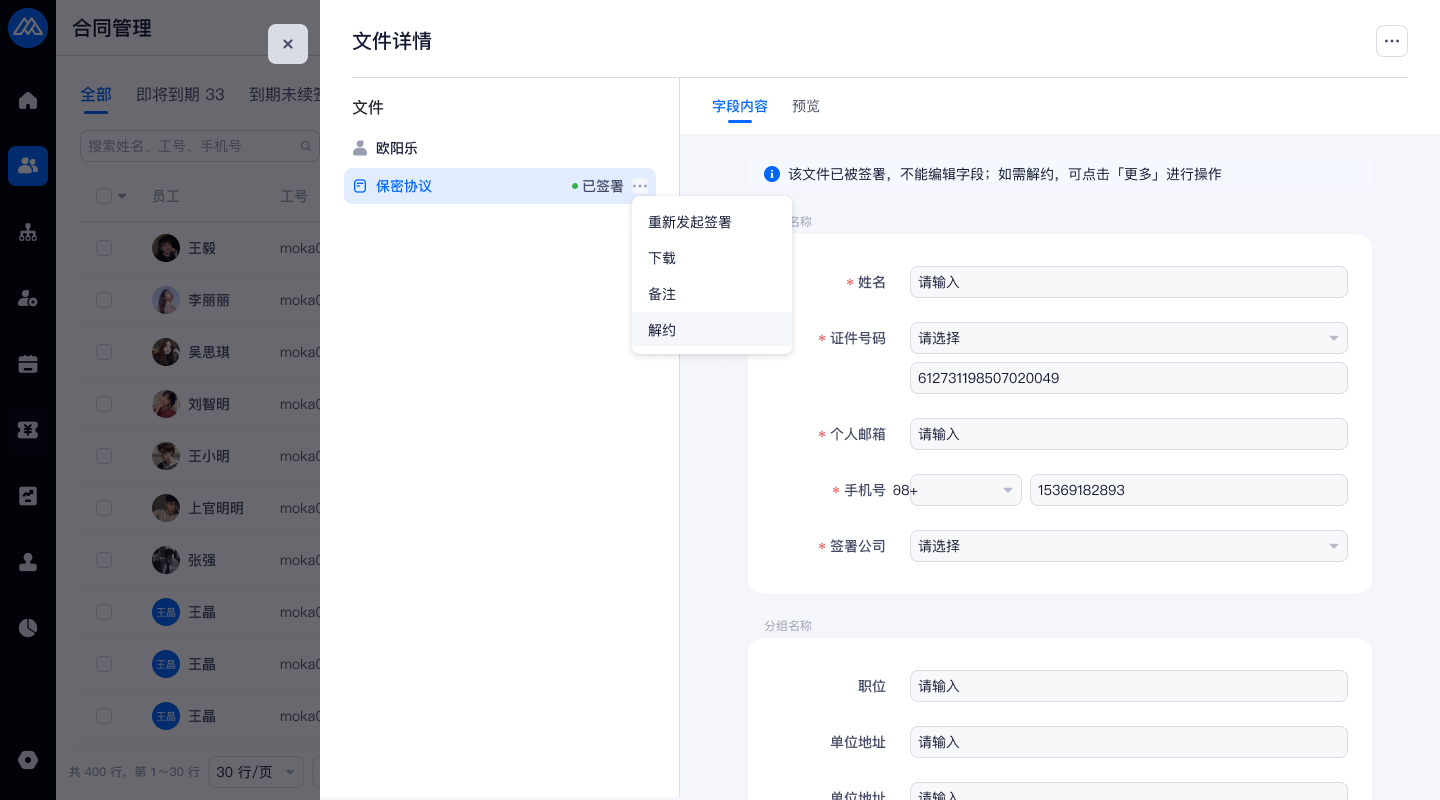 已签署文件不支持在Moka平台解约,关联了已签署文件的合同无法删除