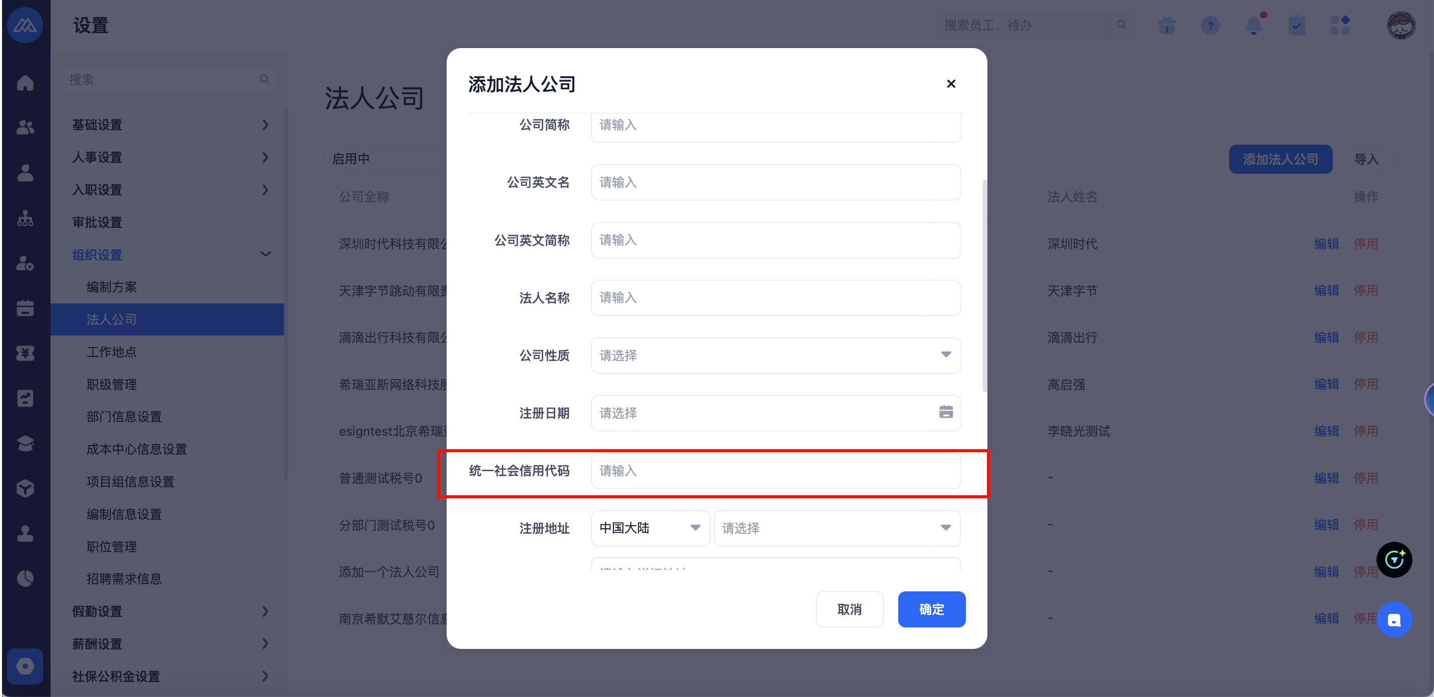 统一社会信用代码:默认填充为签署文件的法人公司的统一社会信用代码。该字段在「设置-组织设置-法人公司」中进行维护