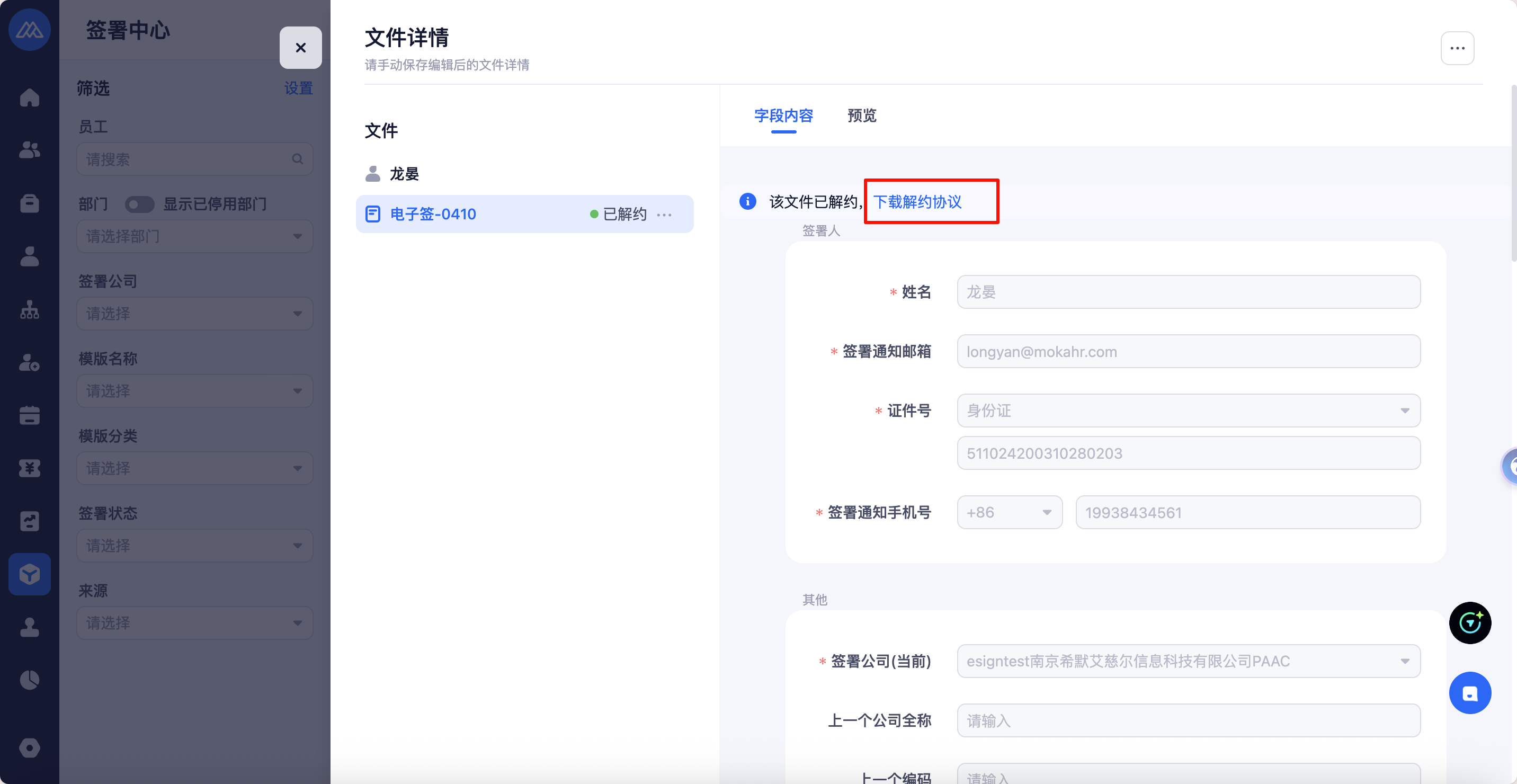 注意:如果在e签宝平台进行解约,暂不支持将状态同步至Moka