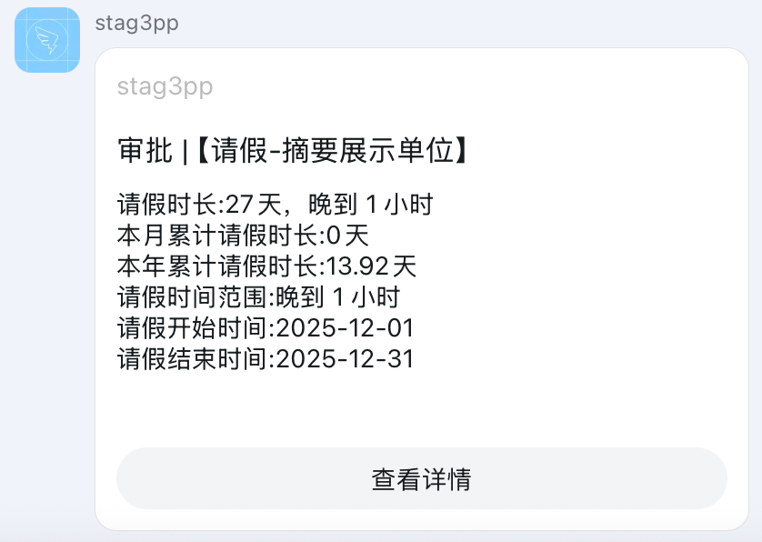 请假、加班、出差、外出审批中存在大量时长相关的字段,在工作台待办、IM待办的审批摘要中未能显示时长的单位,导致审批人或相关人员无法快速查看相关信息