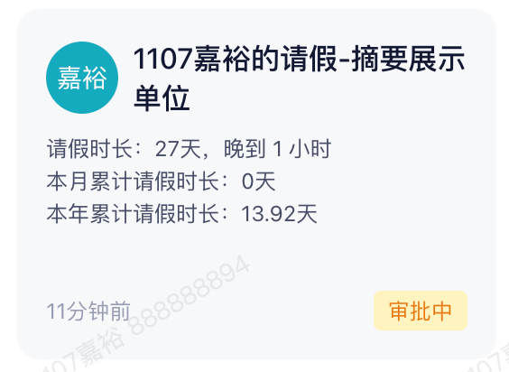 请假、出差、外出、加班的审批摘要中时长相关的字段中需展示完成内容,包括数值+单位。
