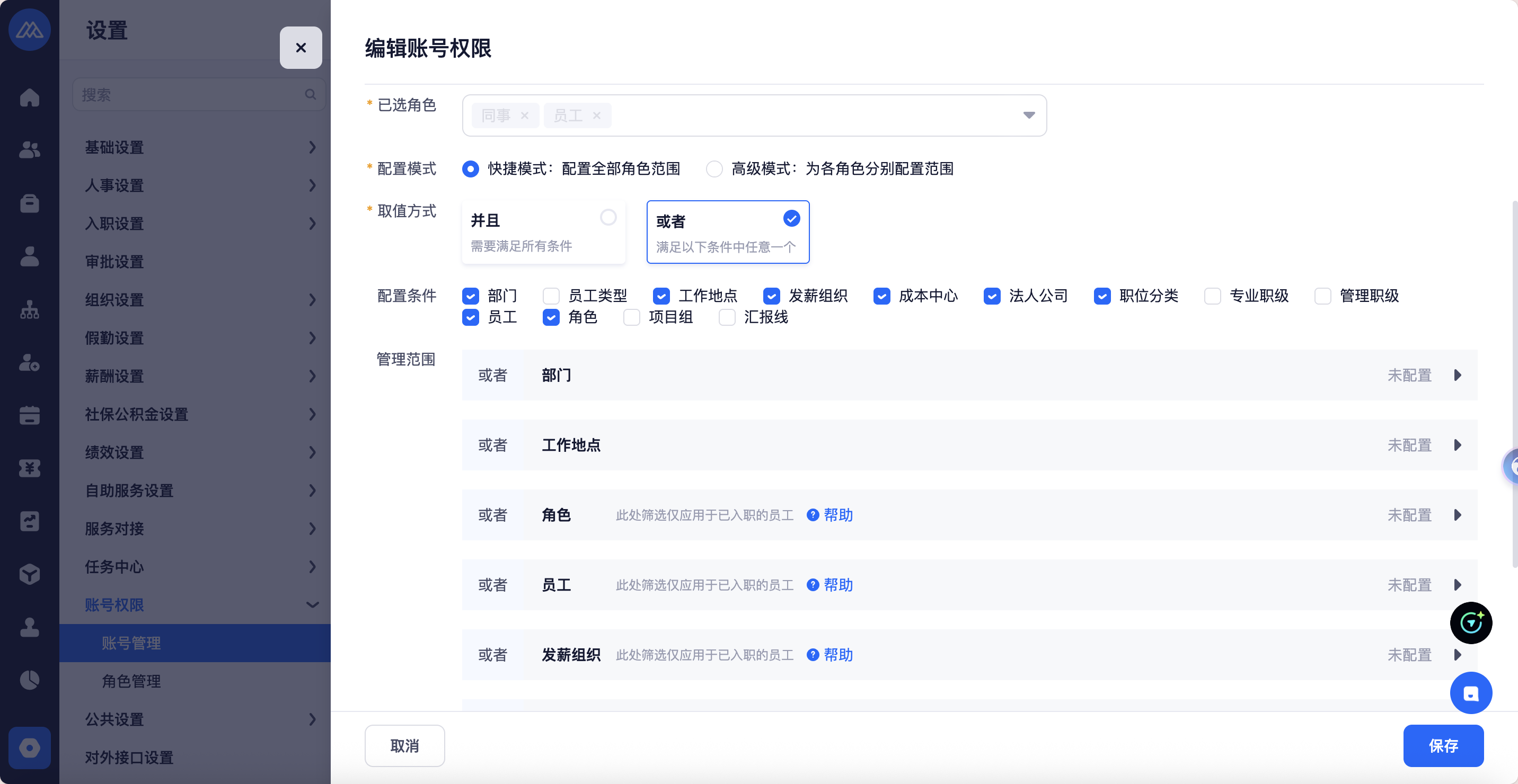 账号权限中,部分管理范围如「员工」「角色」无法筛选待入职员工