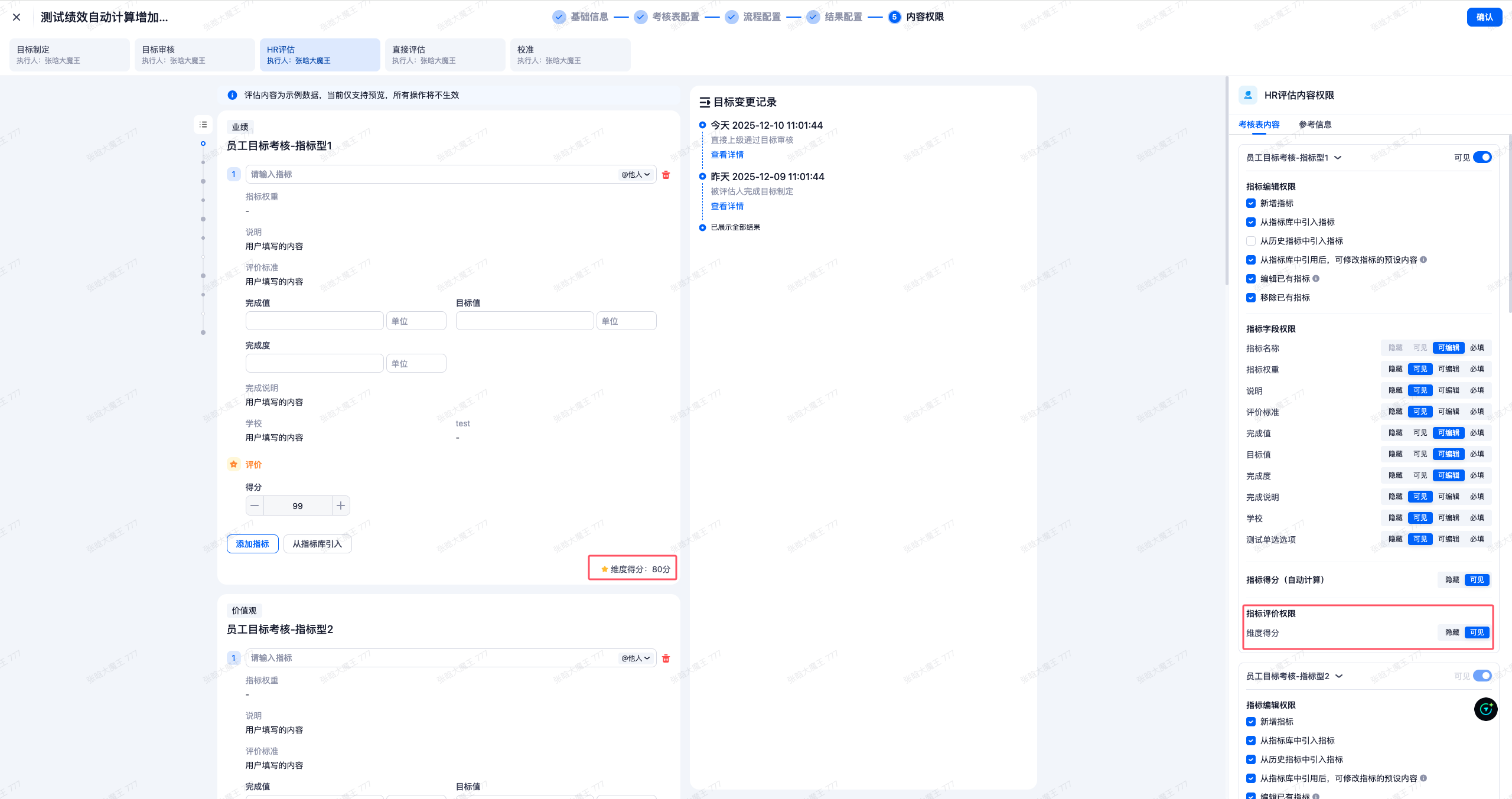 如果维度得分是自动计算,则可以再绩效模板-权限内容中,开启【评估环节】可见维度得分,开启后,评估人在评估环节可见【维度得分】