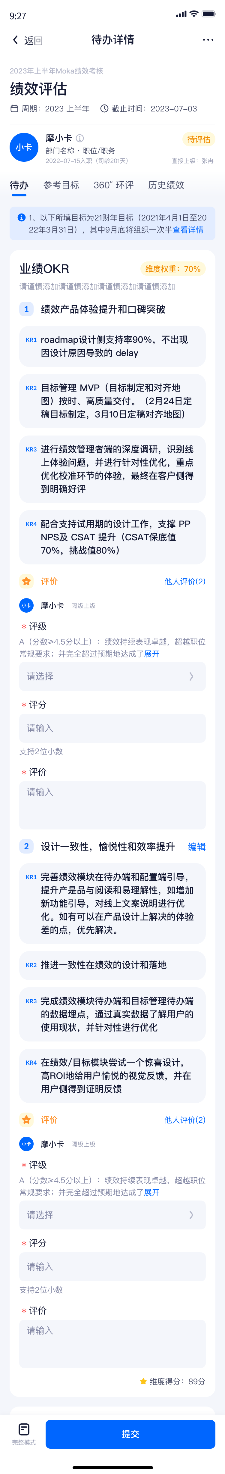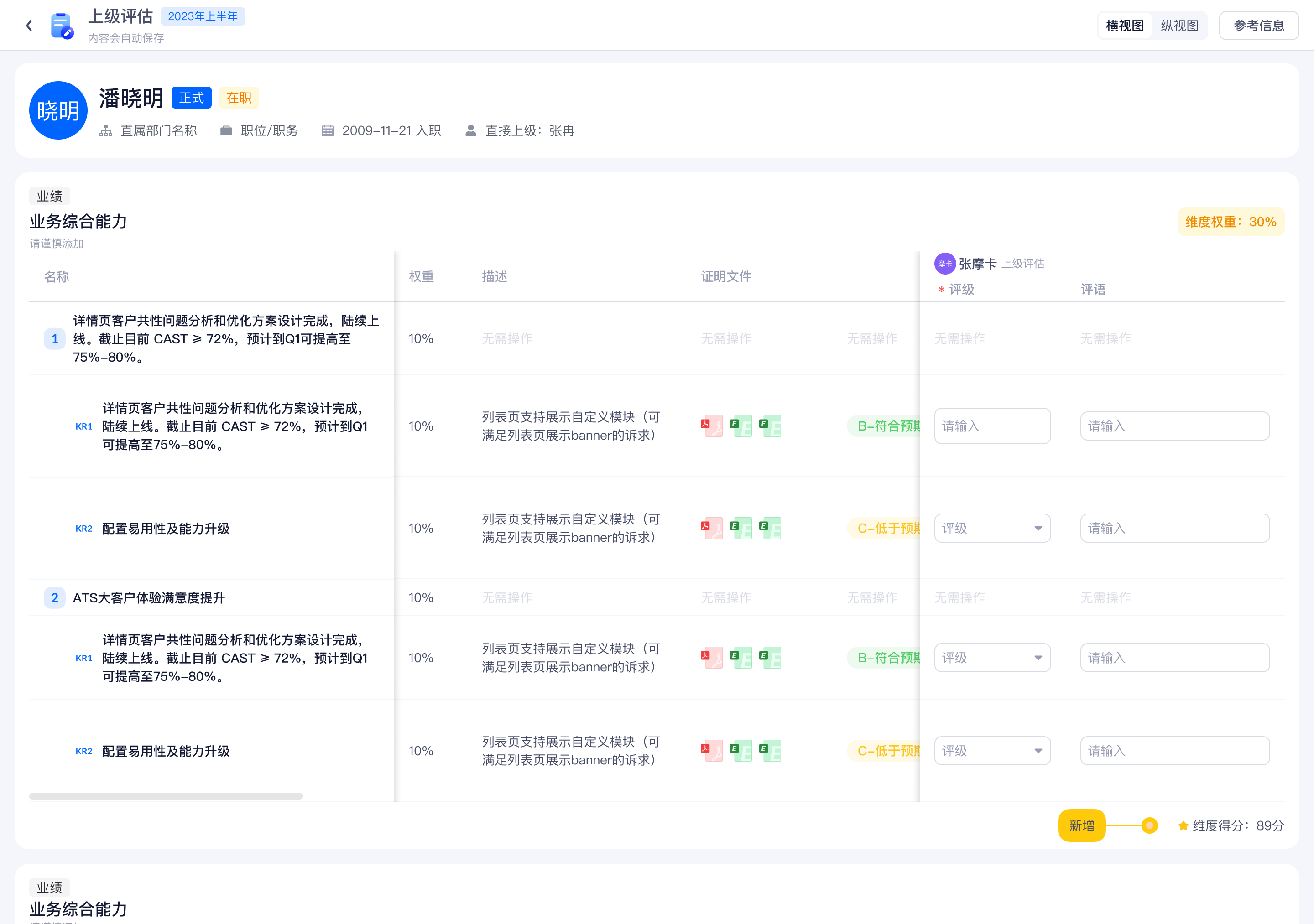 举例:考核表有3个维度,权重分别是20%,30%,50%,张三仅具备评估20%的维度,打分后维度得分是100,但总分会默认*20%,导致用户看到的是20分,和用户预期不符