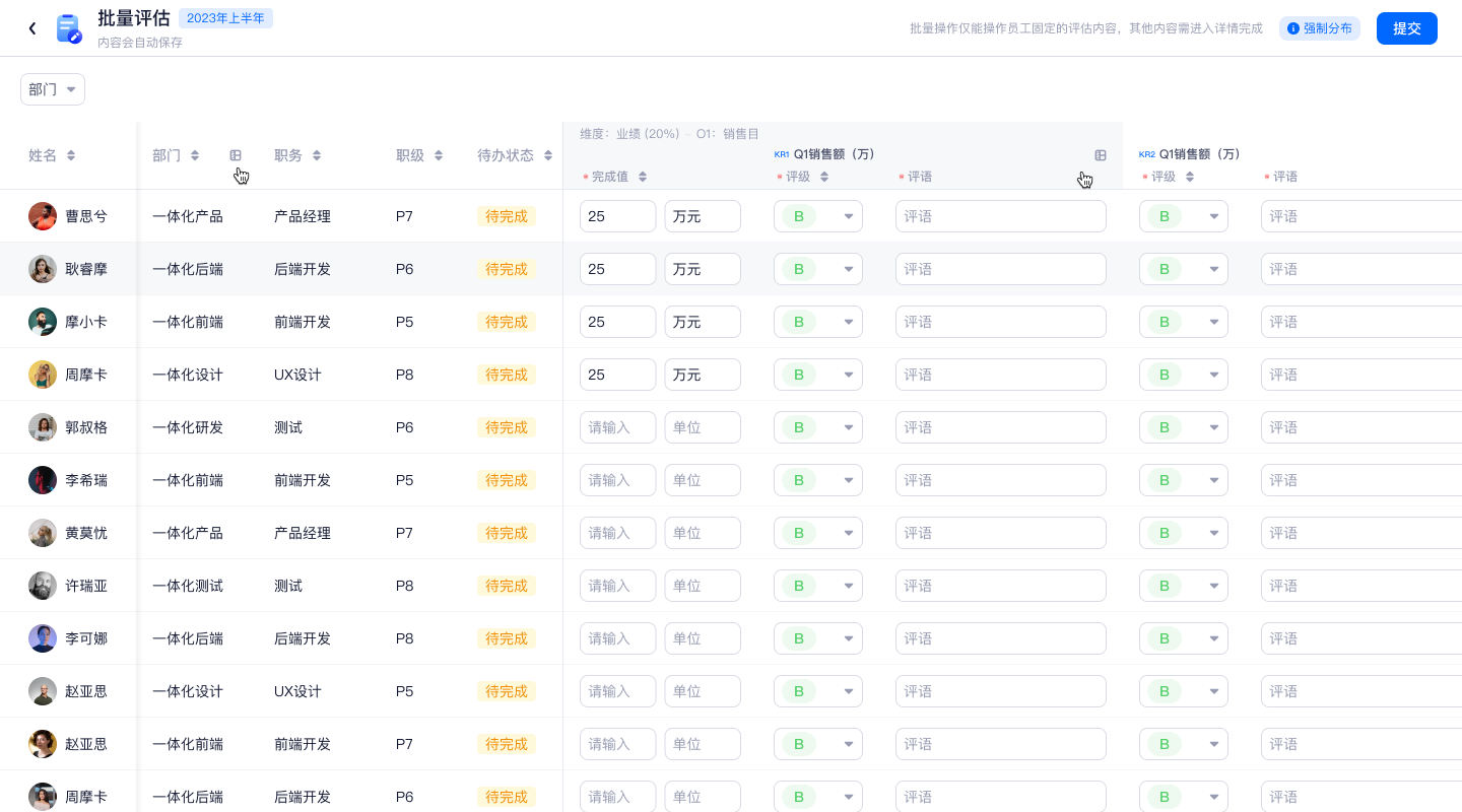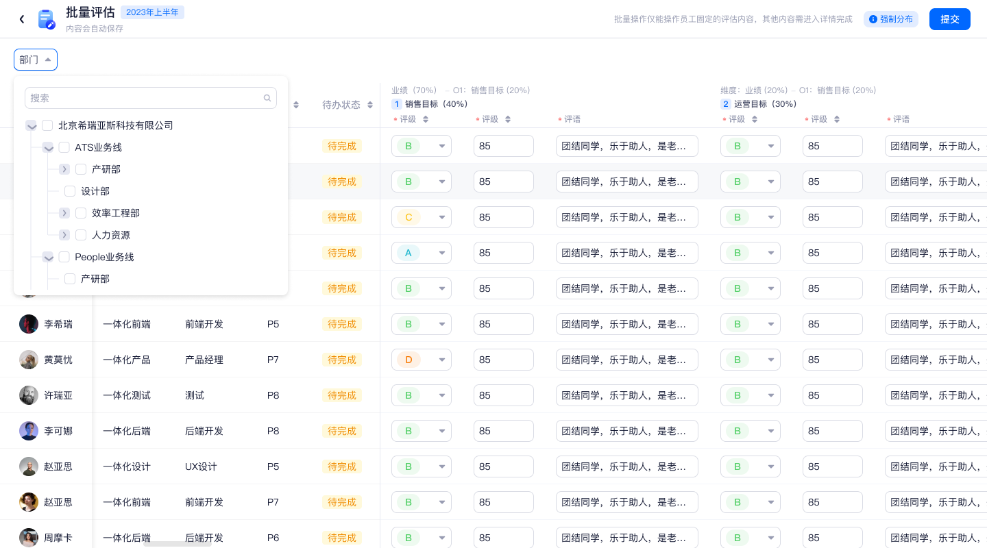 二级主管做绩效校准时(借助评估环节完成),因为用户要看子部门的部分,批量评估没有部门筛选,导致操作效率低