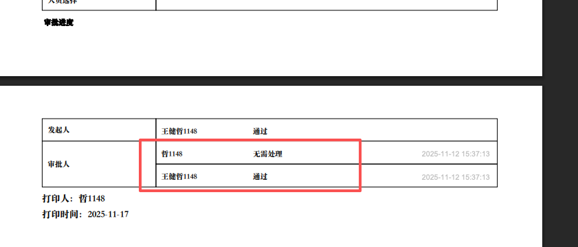 审批单打印时,或签节点,将按以下格式打印节点下全部人员(部分客户觉得打印内容冗余,希望可以只打印实际审批人)