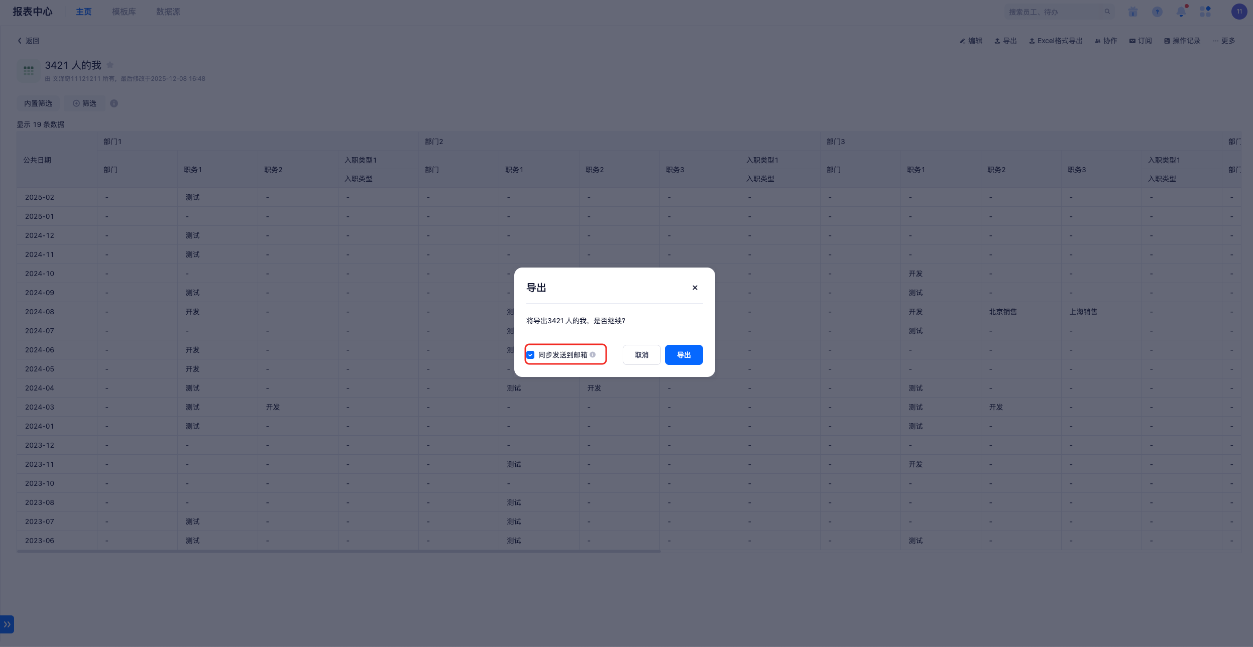 报表导出、按Excel格式导出时,增加导出弹窗,可选择是否发送至邮箱,hover提示当前用户邮箱,默认不勾选(会记录上次选择)