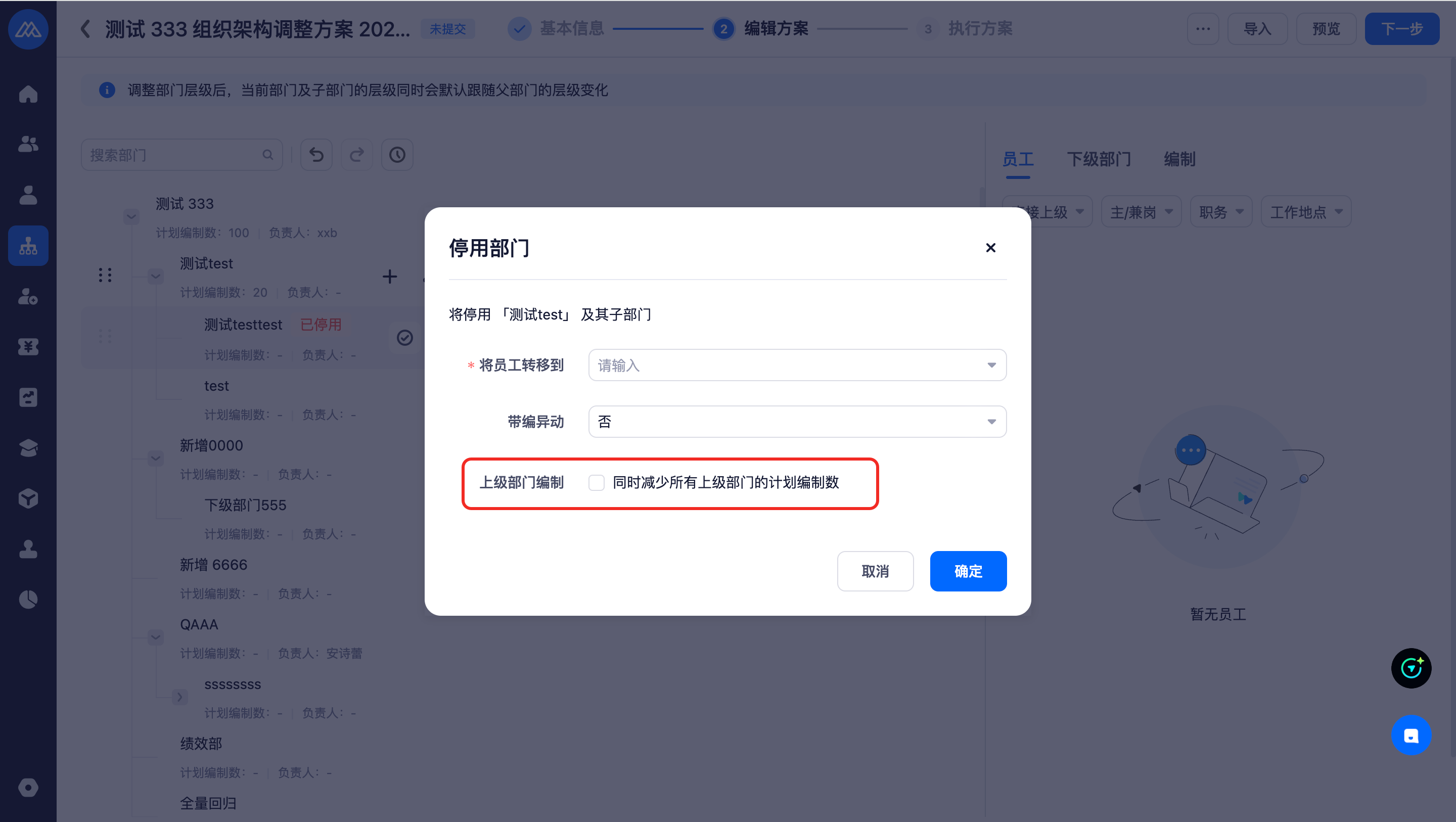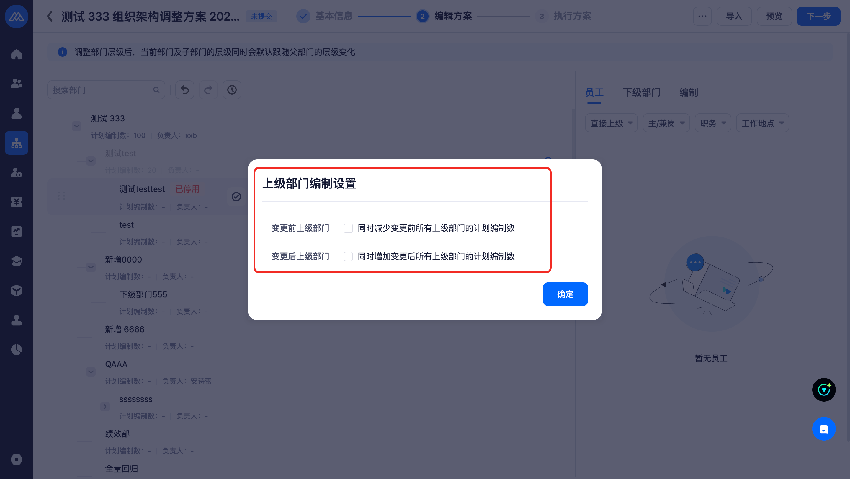 ● 组织架构调整时,同步变更上级编制的功能,会校验编制的编辑权限