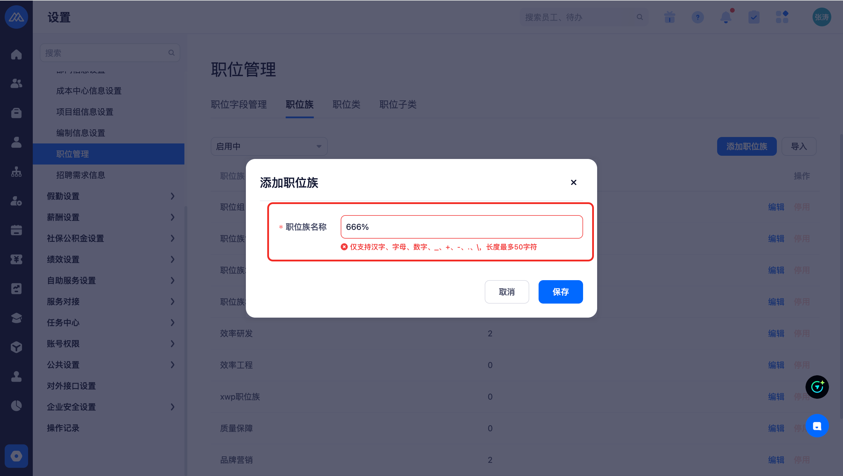 ● 在「设置-组织设置-职位管理」中,添加/编辑职位族、职位类、职位子类时,名称的限制调整为以下2点: