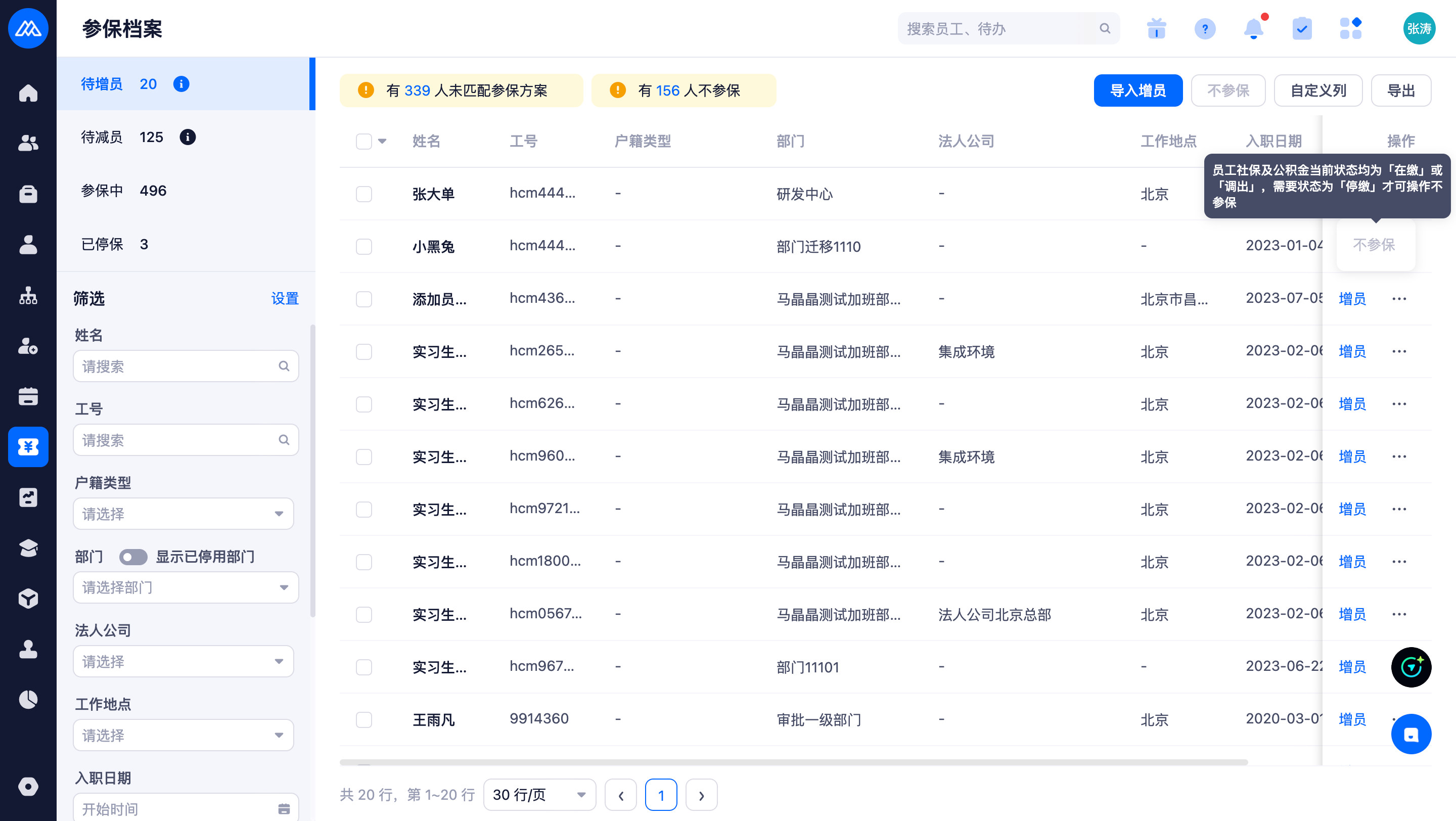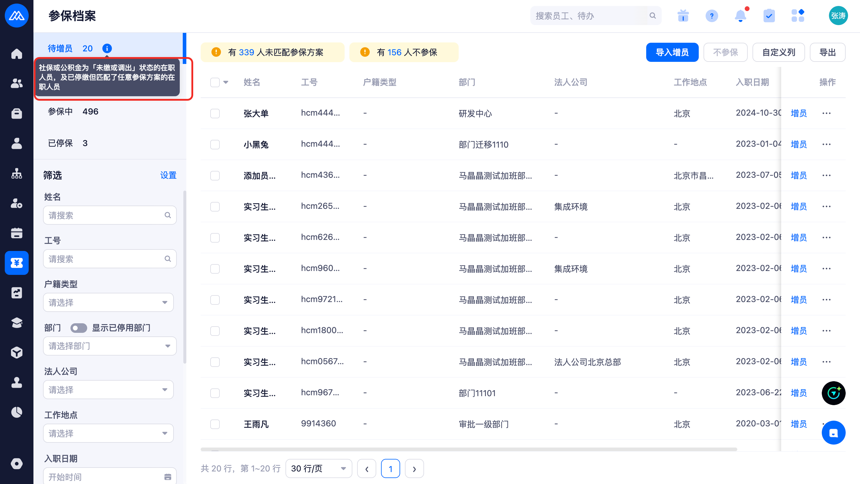 ● 待增员列表提示文案优化为:社保或公积金为「未缴或调出」状态的在职人员,及已停缴但匹配了任意参保方案的在职人员