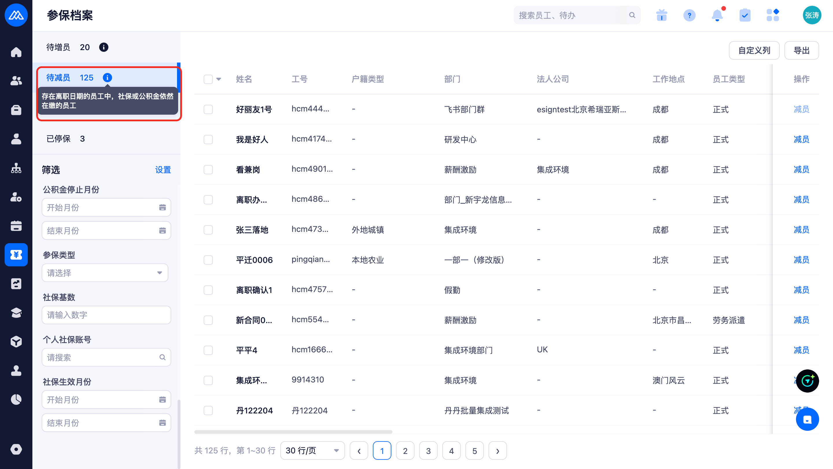 ● 待减员列表的人员查询逻辑不合理:未来月份的待减员人员不显示,仅展示已离职&在缴状态的员工;法人公司筛选无效
