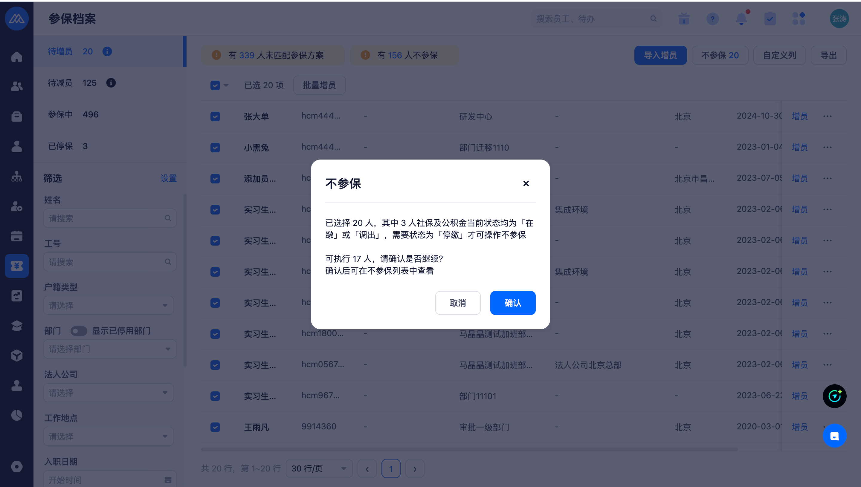 ● 待增员列表及未匹配参保方案列表中,点击「不参保」时,若员工的公积金和社保均为「停缴」状态时,允许设置为「不参保」