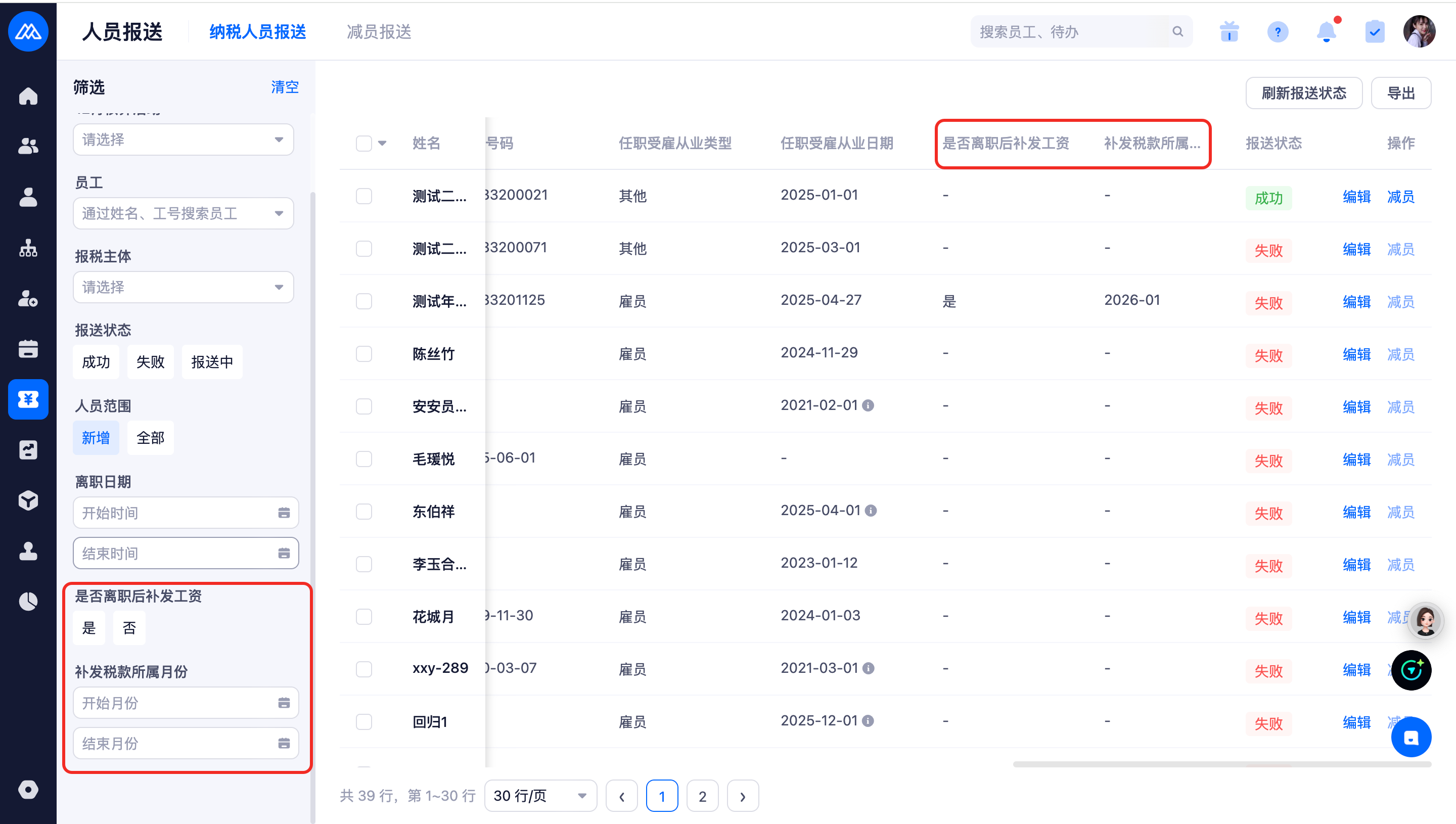 在「纳税人员报送」和「减员报送」列表中增加以下3个字段,且均支持筛选: