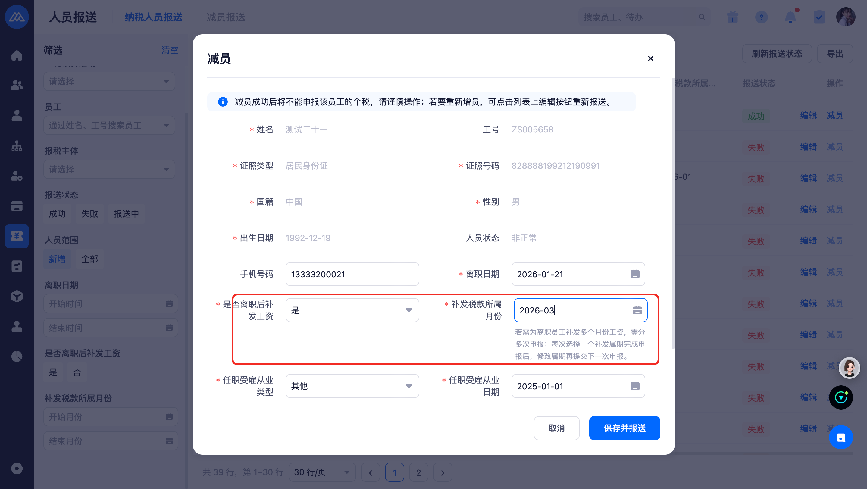 当前为1月份属期,员工离职日期是26年1月10日,补发月份填写为2026年2月时,实际不会减员,1月和2月都算会算税,实际3月会自动减员