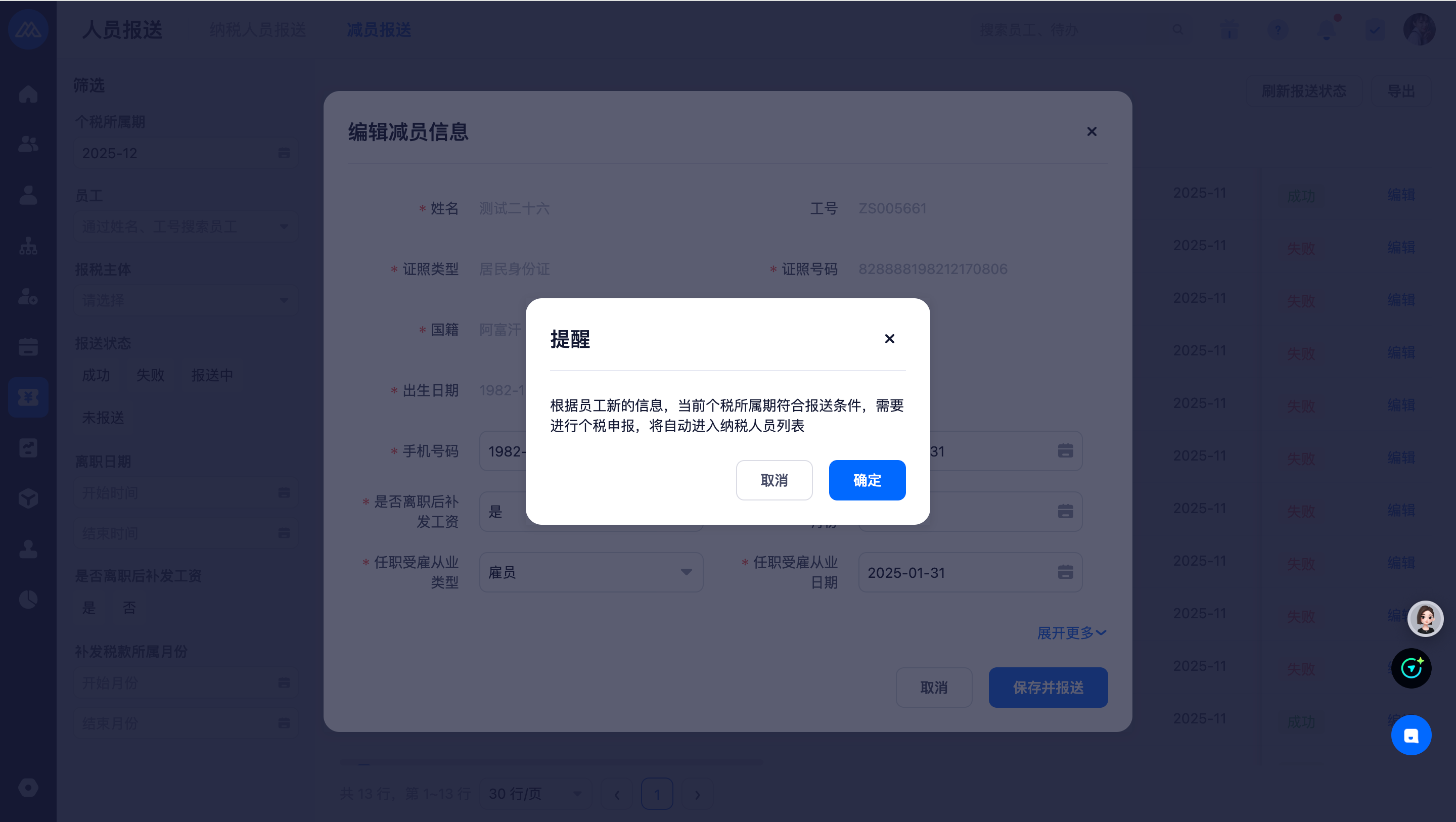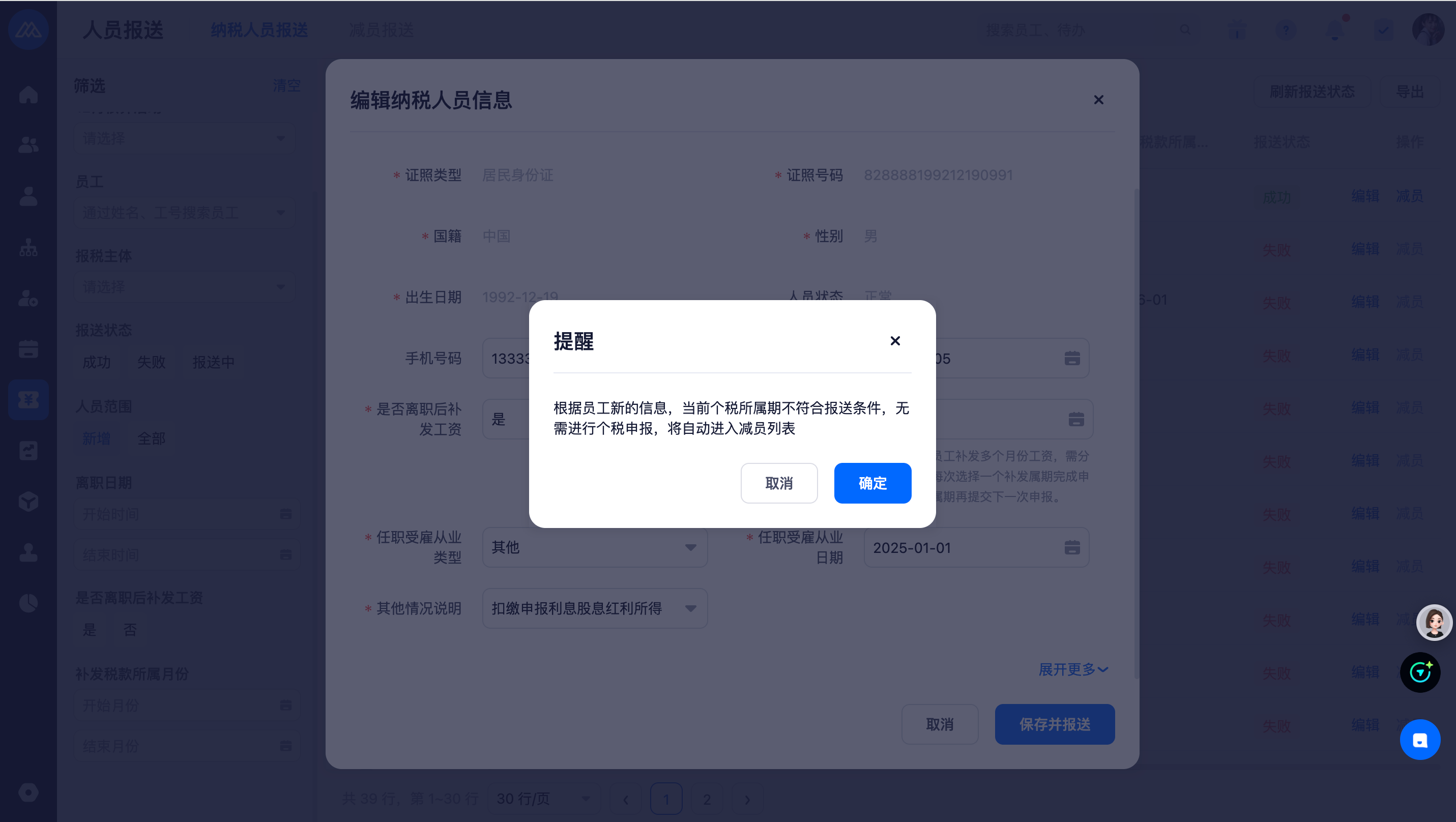 若是编辑产生的减员,此时操作需要给提示:根据员工新的信息,当前个税所属期不符合报送条件,无需进行个税申报,将自动进入减员列表
