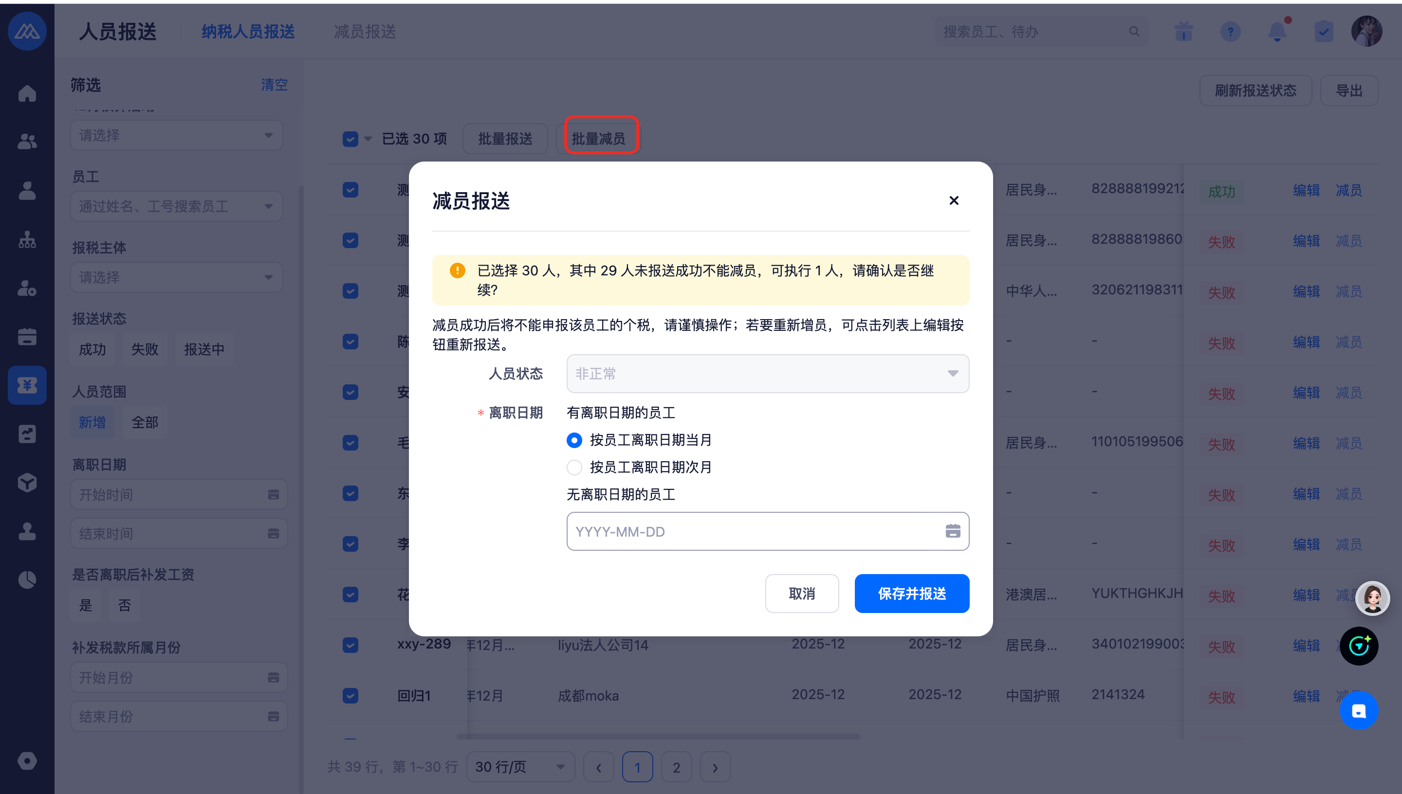 注意:目前系统批量操作时,对于报送成功的员工是不会重新报送的,若需要支持已报送成功的员工也能重新报送请联系产品开通相关功能