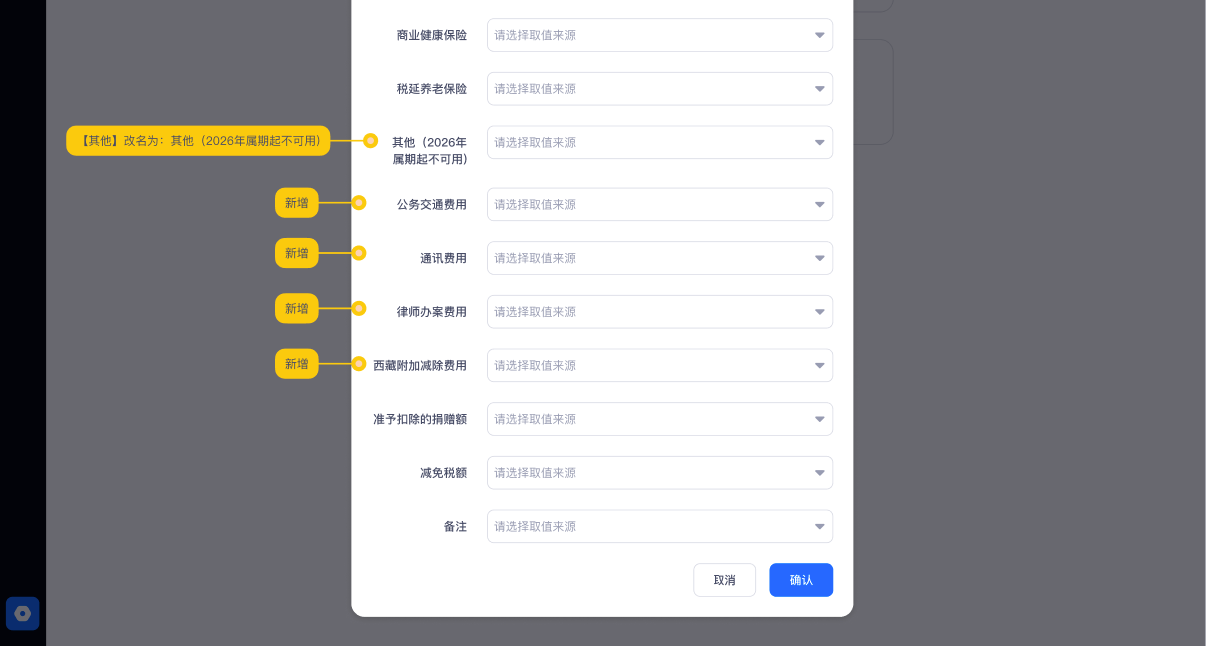 | 【其他】改名为:其他(2026年属期起不可用) 税友做了兼容,26年属期起即使传值了也不可用 增加字段:非必填 公务交通费用 通讯费用 律师办案费用 西藏附加减除费用 |
