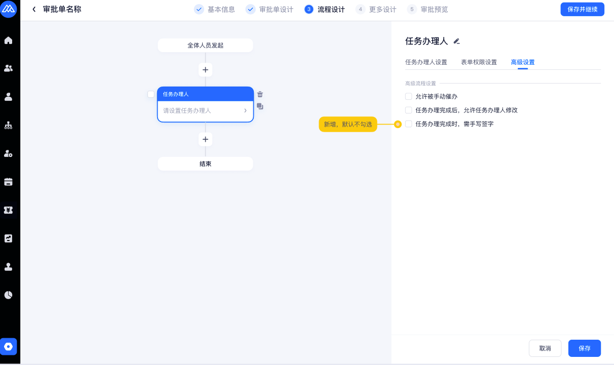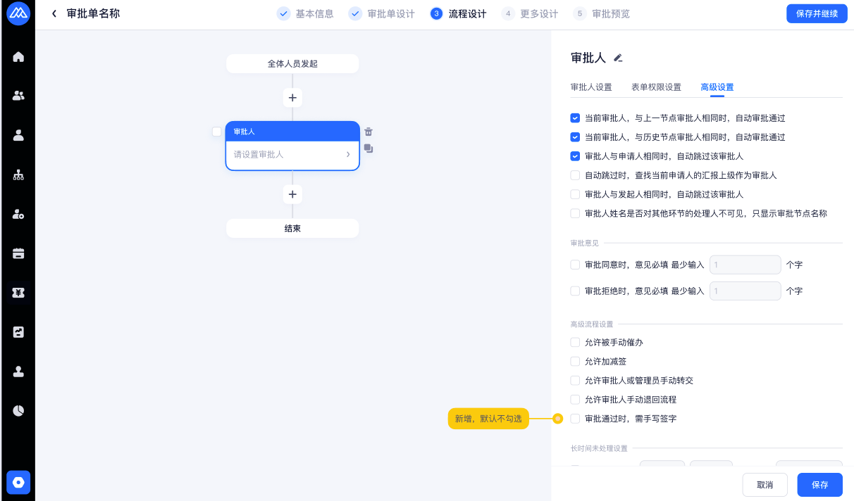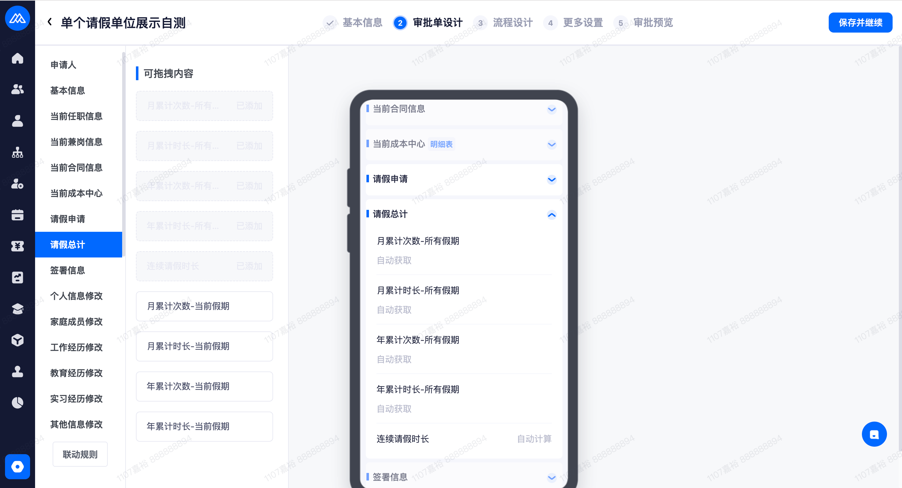 单个请假审批中增加4个统计字段,均默认不展示,可删除。可作为分支判断条件使用。