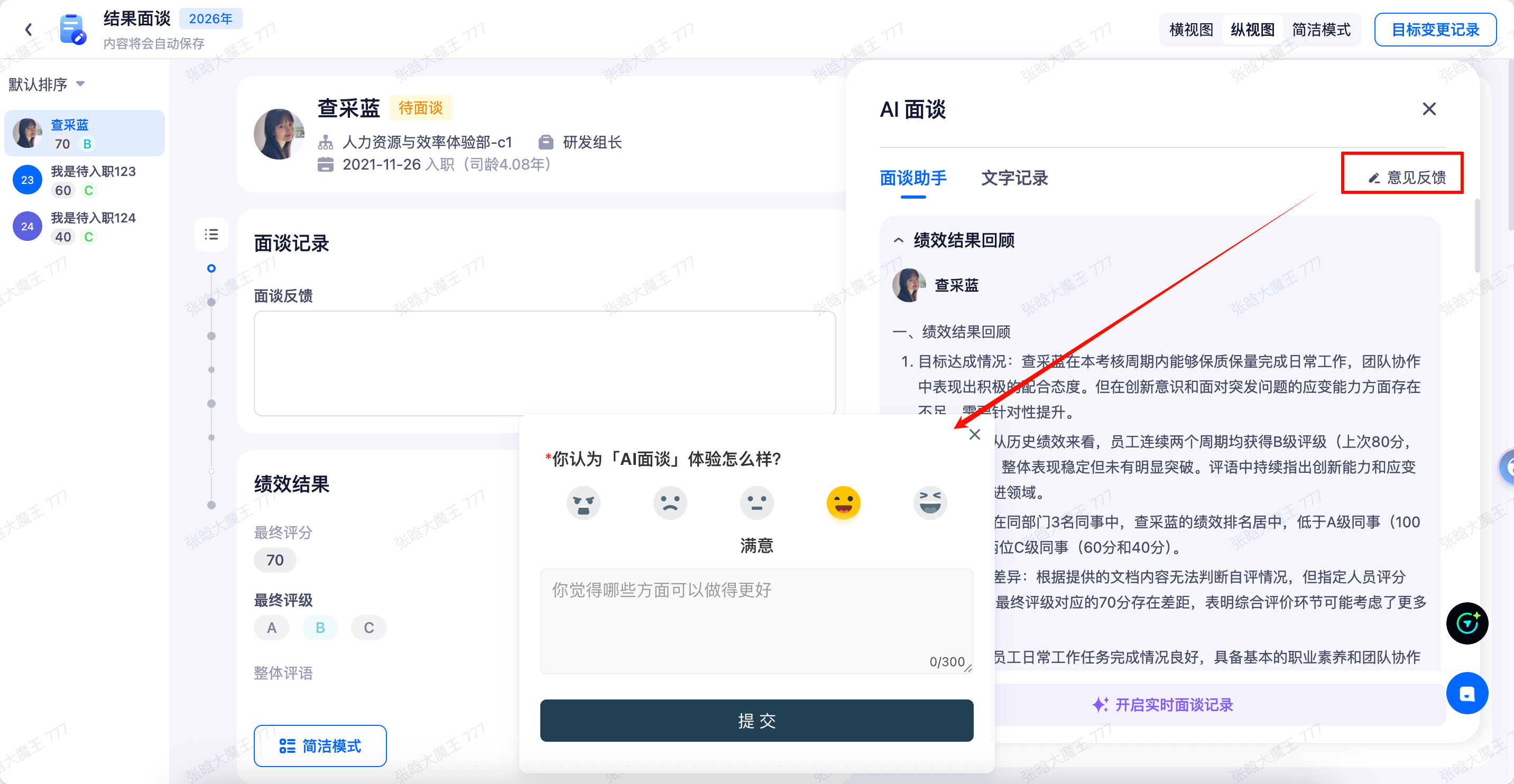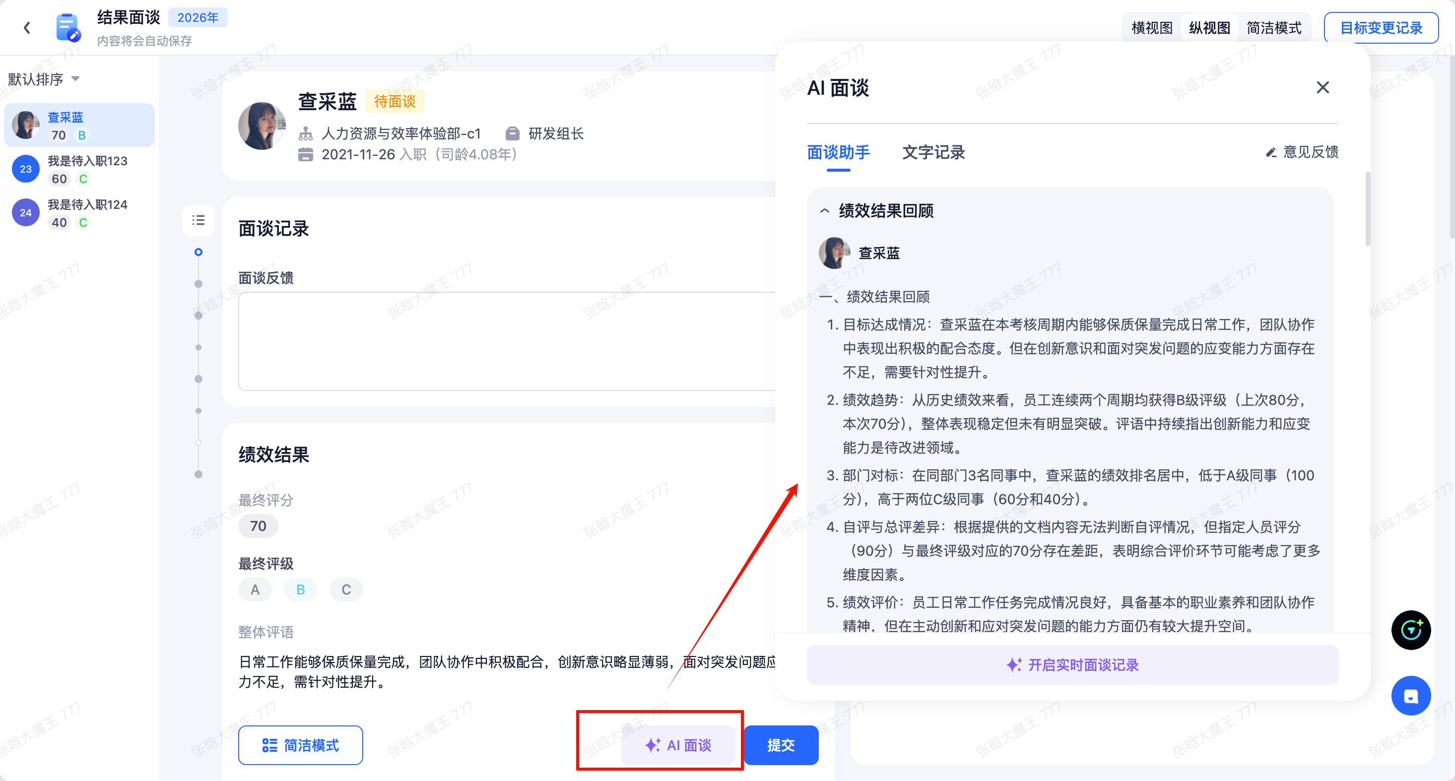 注意:绩效结果回顾、实时录制转写、面谈总结功能的使用均通过后台开关统一控制,如需要开启AI面谈能力,可联系客户成功经理开启(内部联系产品)