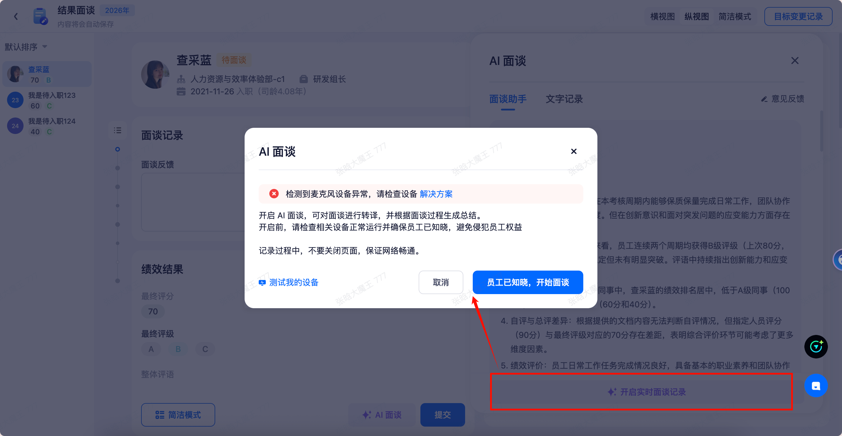 点击「开启实时面谈记录」,开始进行录音设备准备,准备好就可进行实时面谈录制转写了