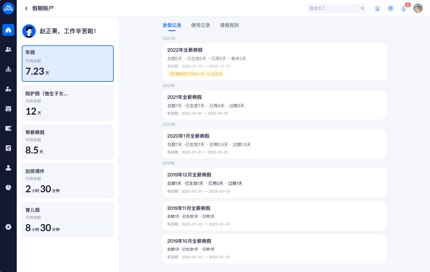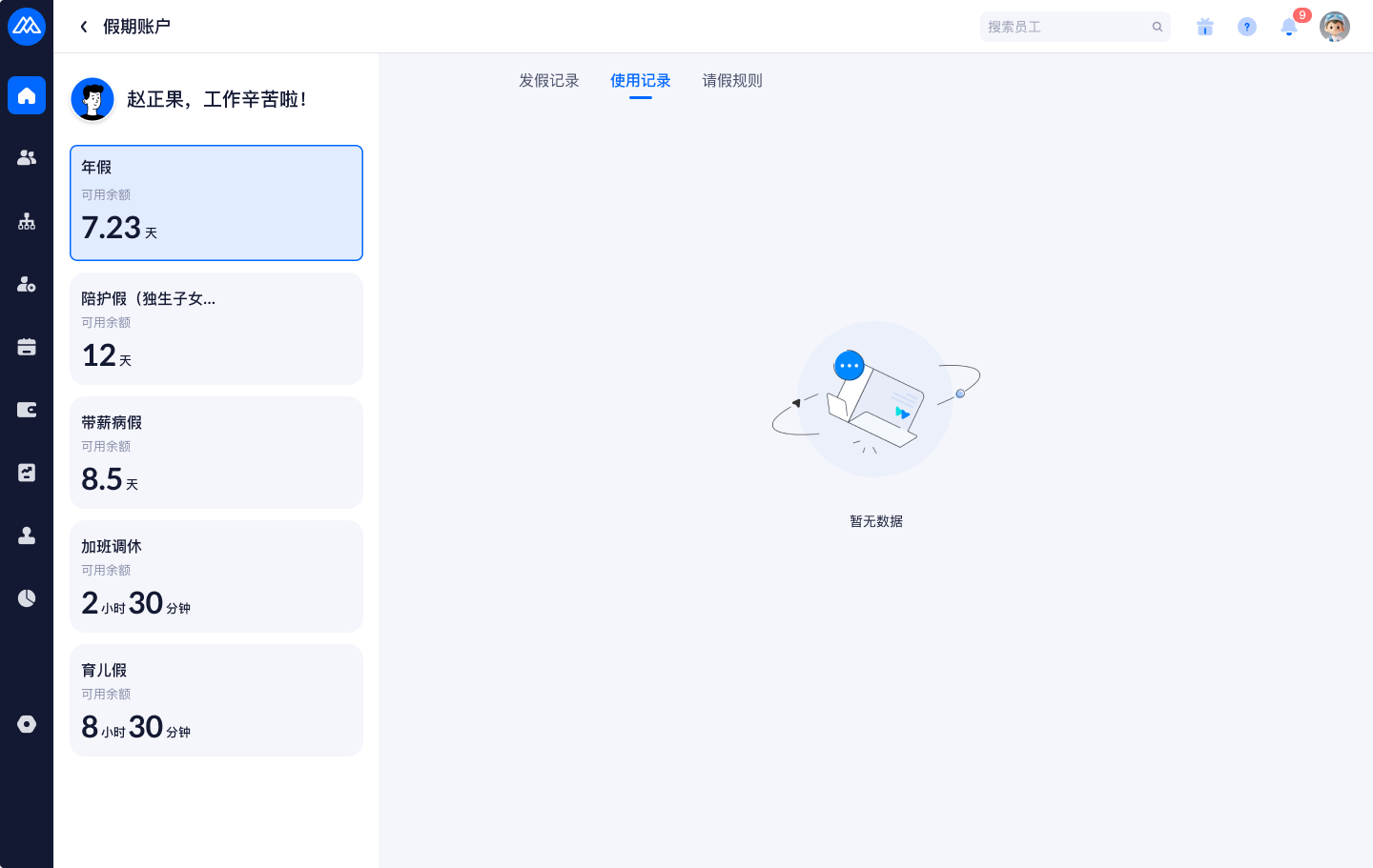 点击进入假期账户,左侧展示左右假期余额,右侧展示发假记录、使用记录和请假规则