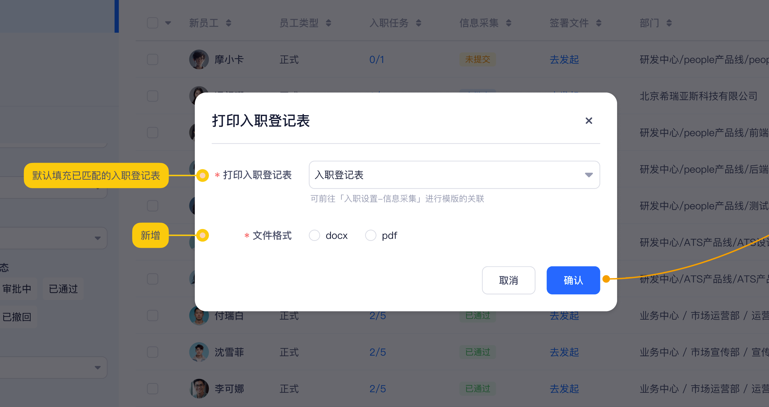 升级内容 1:入职管理打印登记表时支持导出Word格式文件