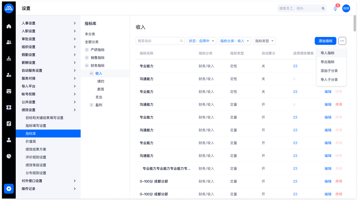 5.指标的适用范围跟随指标分类,若为空则视为未分类,适用范围为全体员工